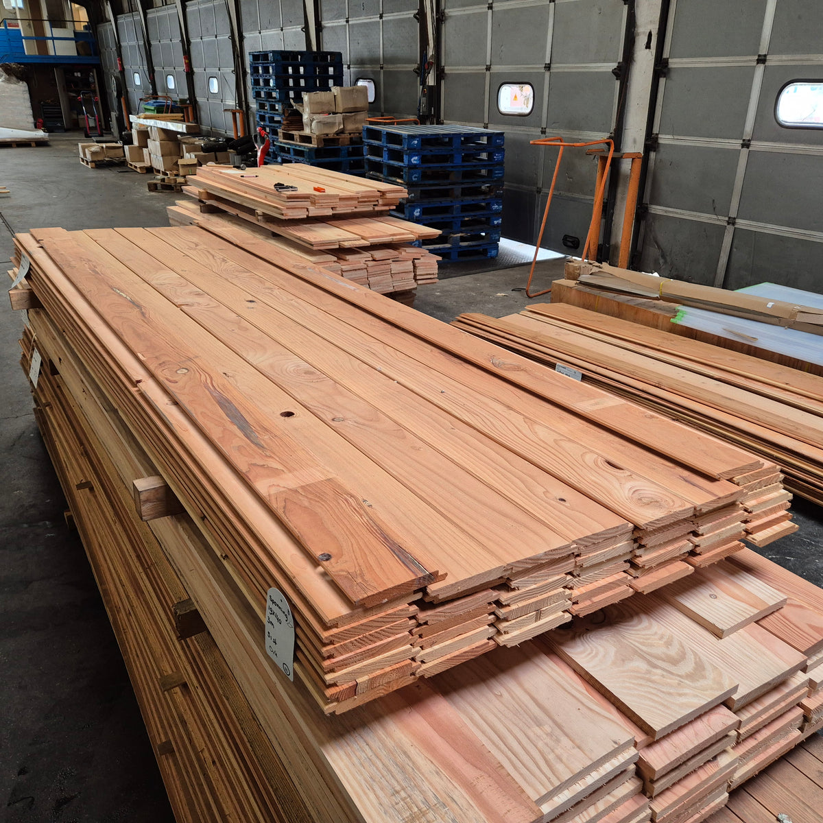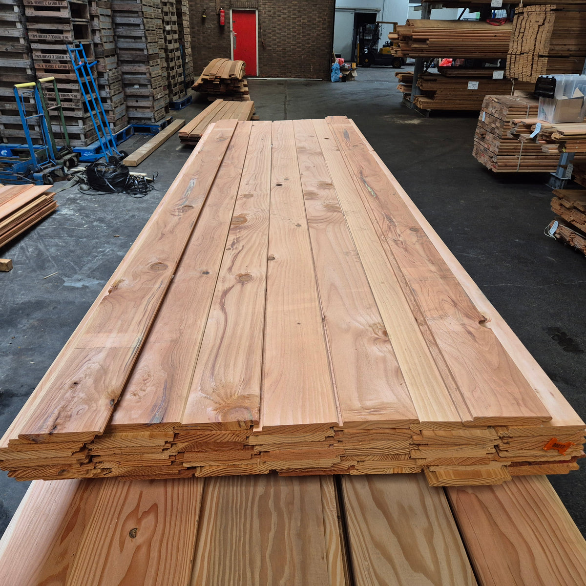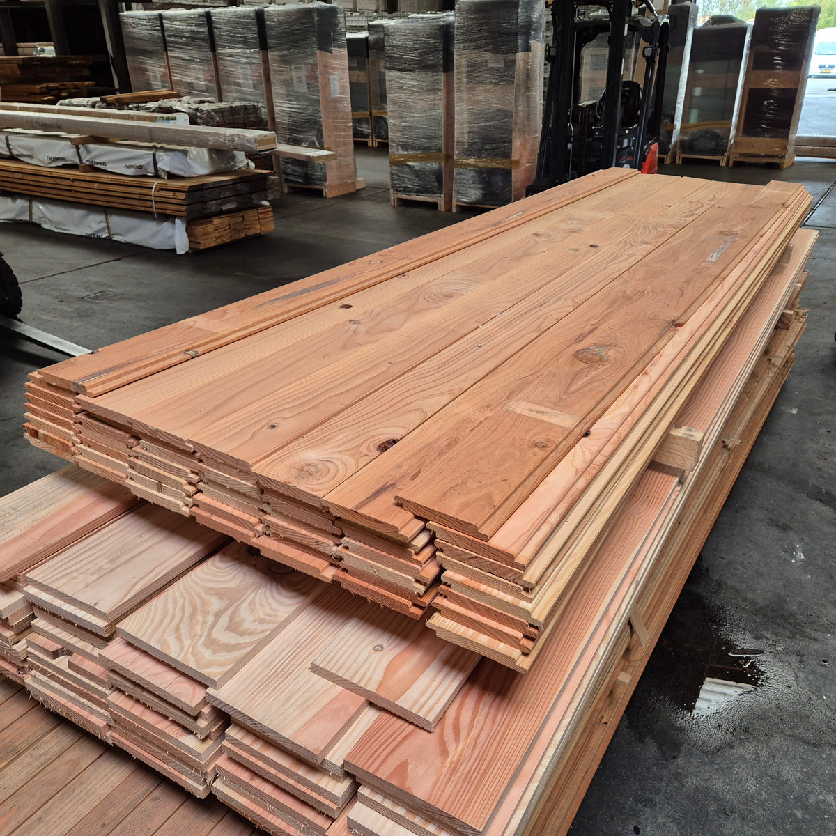 Een partij Douglas gevelbekleding met een Halfhouts Rabat profiel.