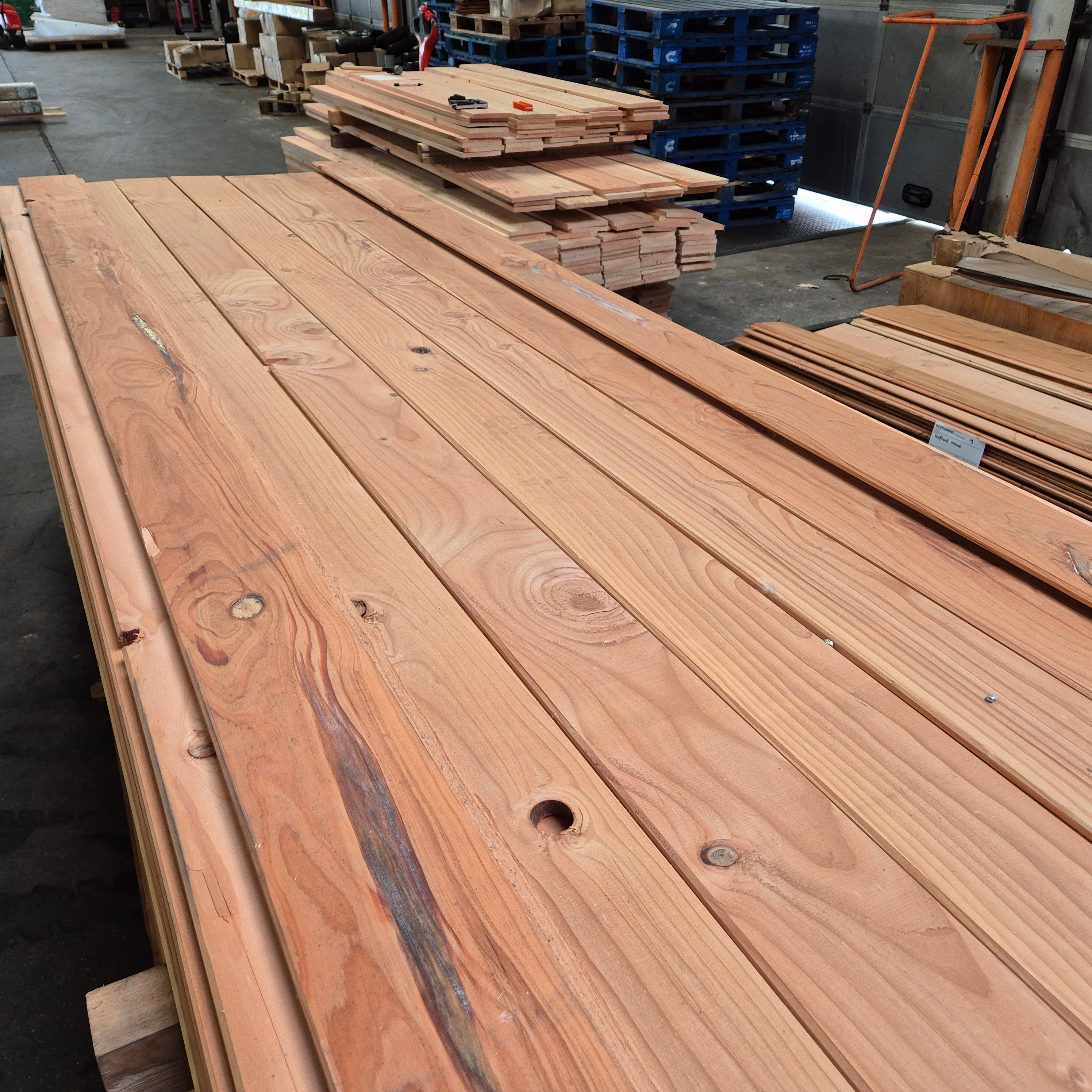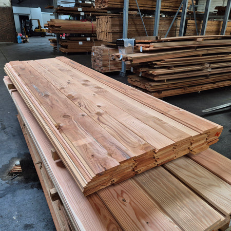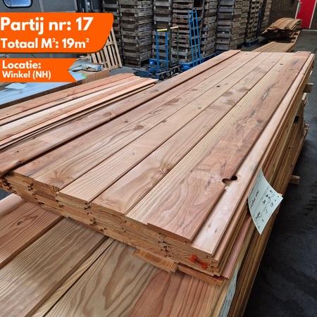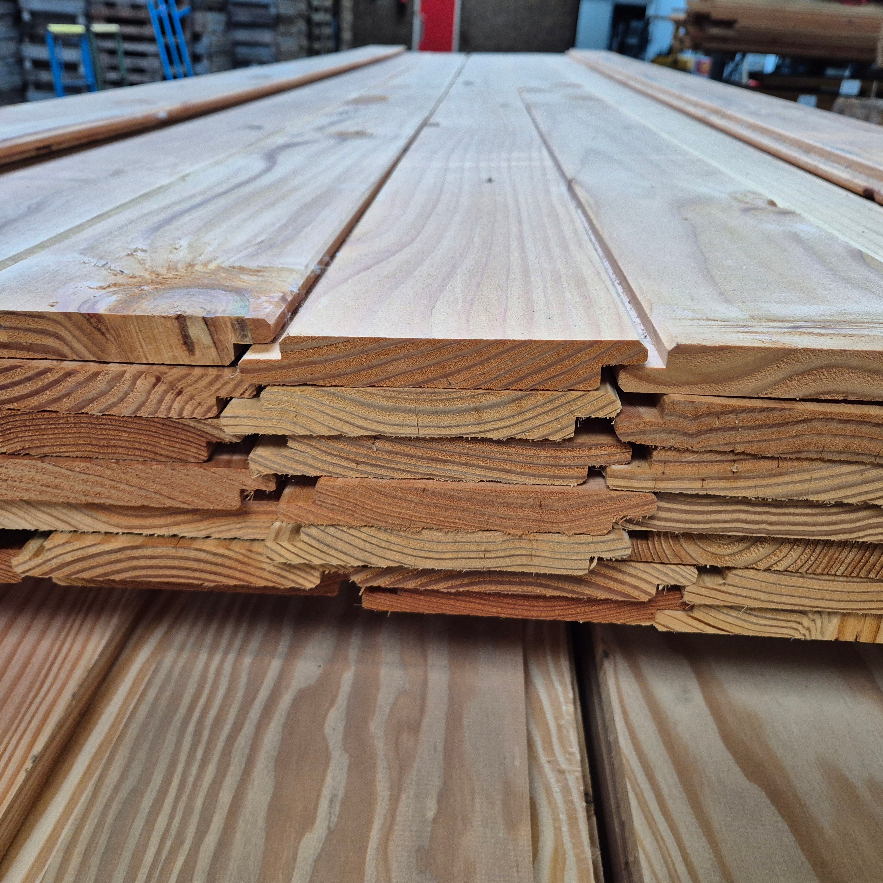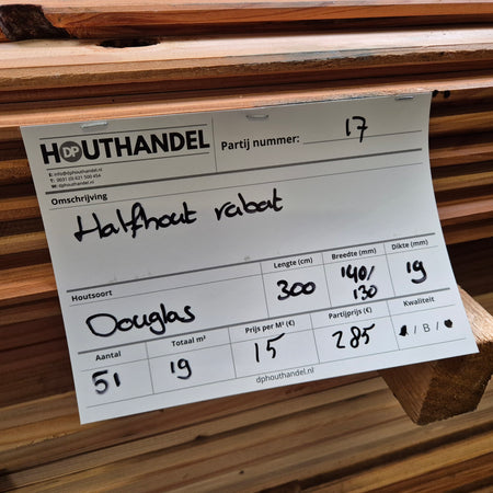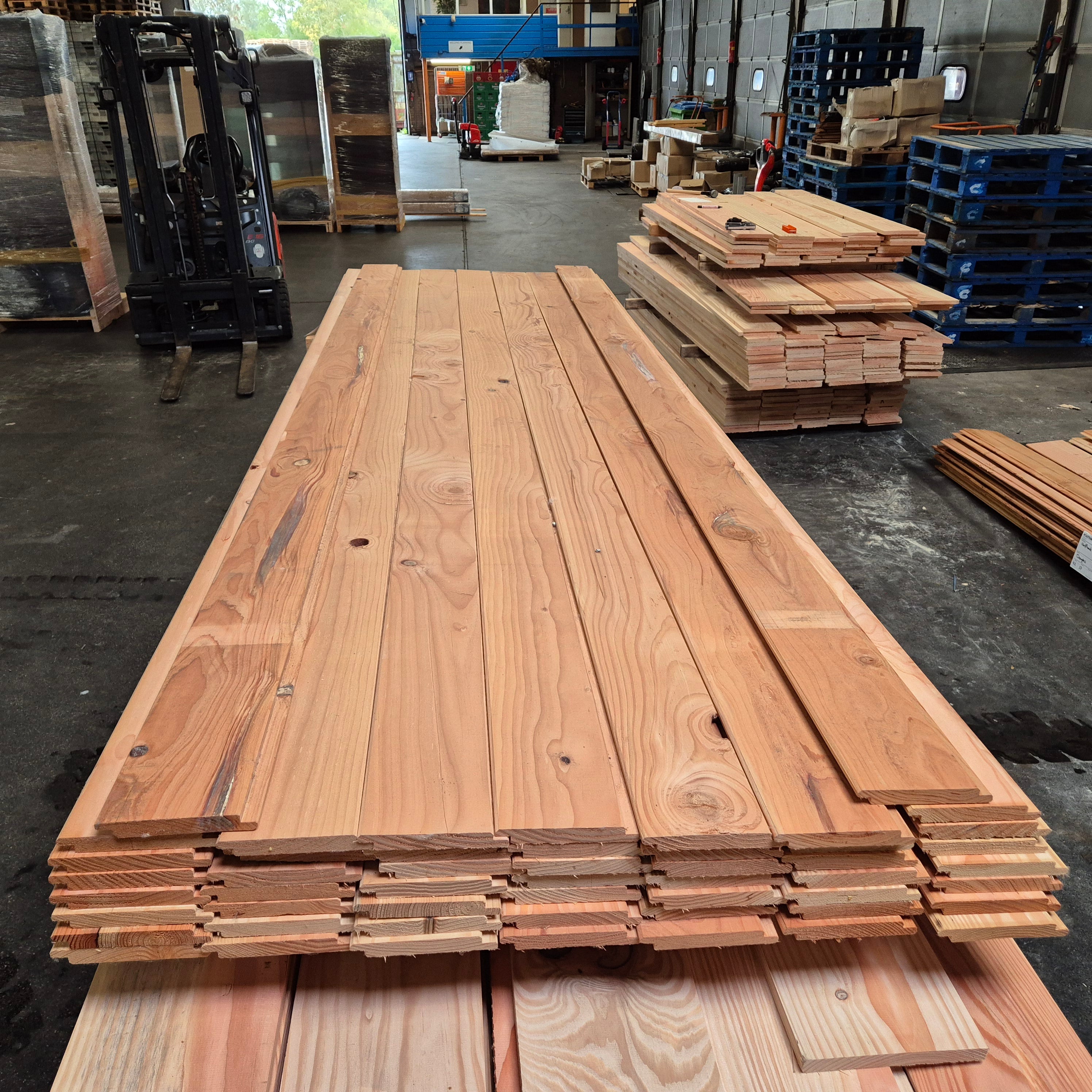 Een partij Douglas gevelbekleding met een Halfhouts Rabat profiel.
