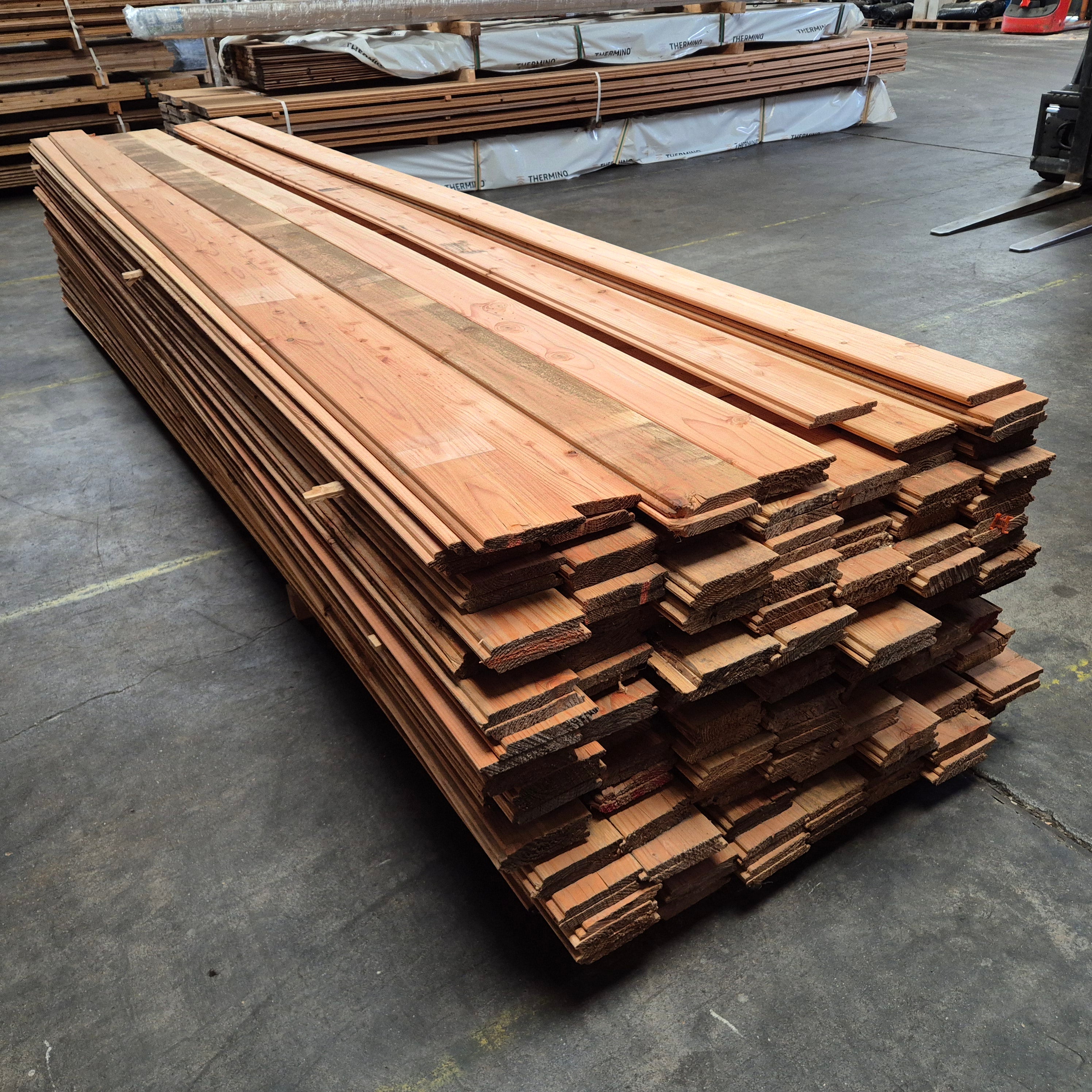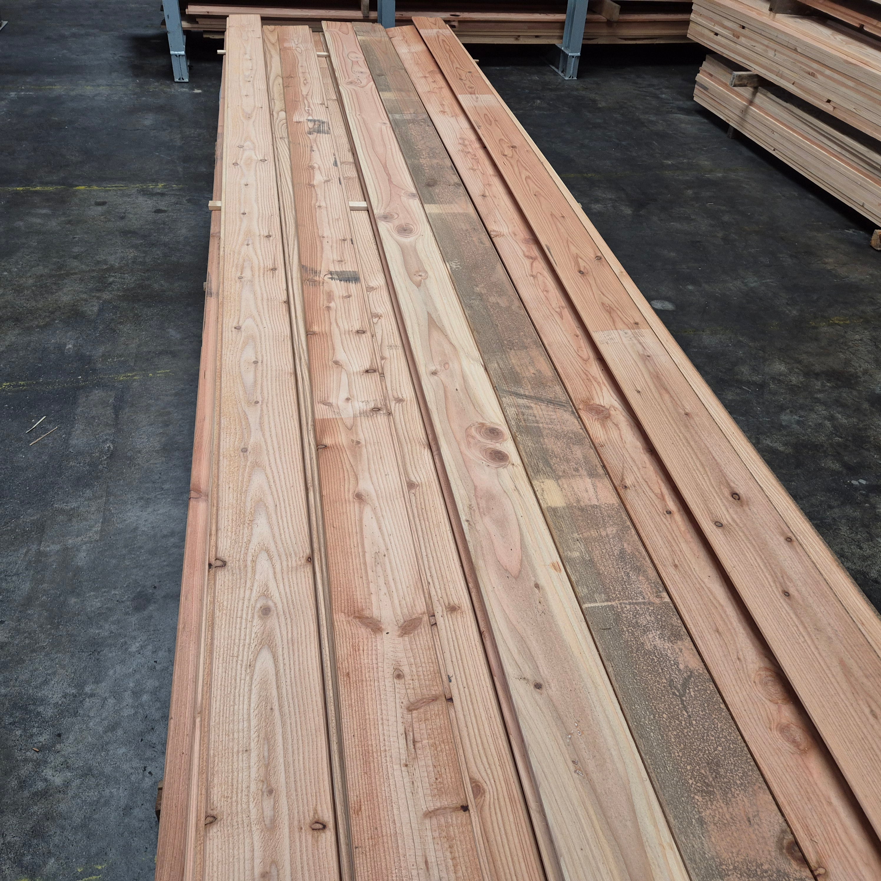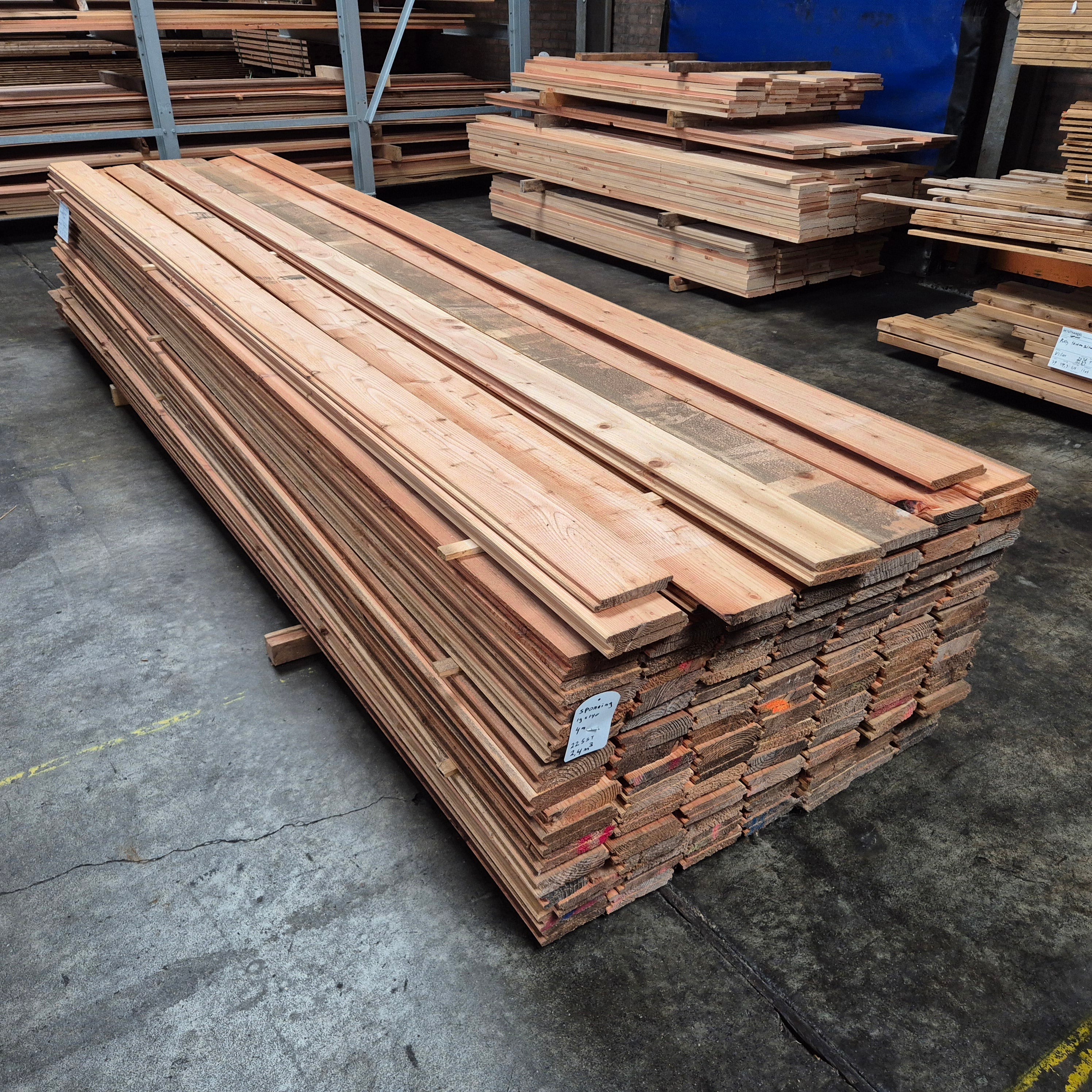 Een partij Douglas gevelbekleding met een Halfhouts Rabat profiel.