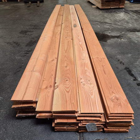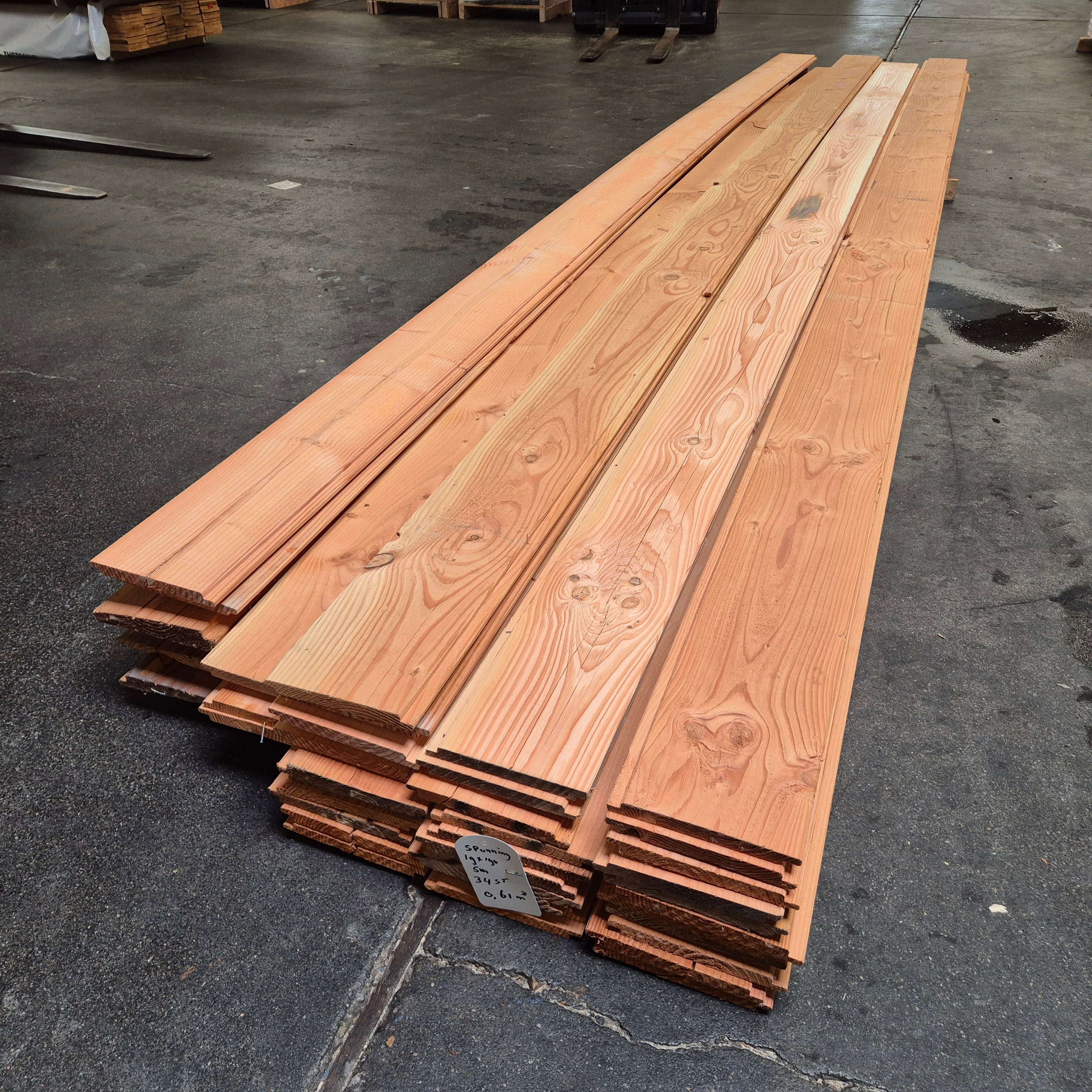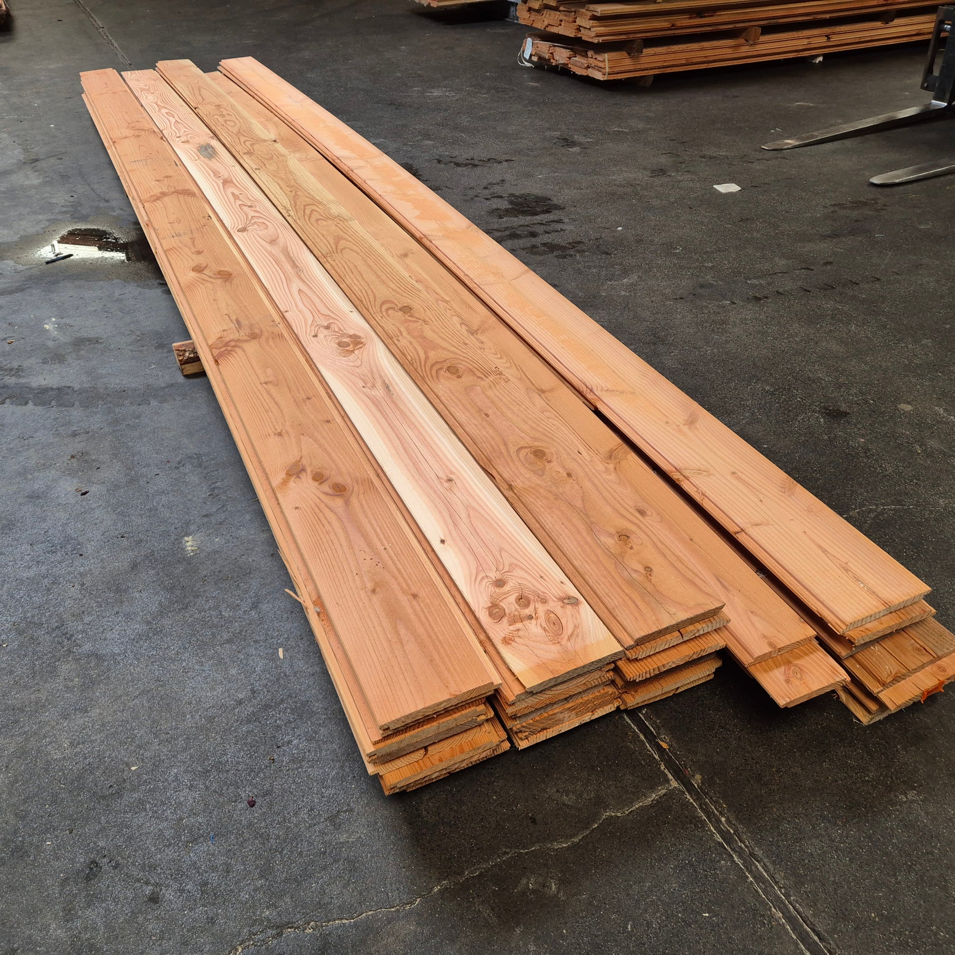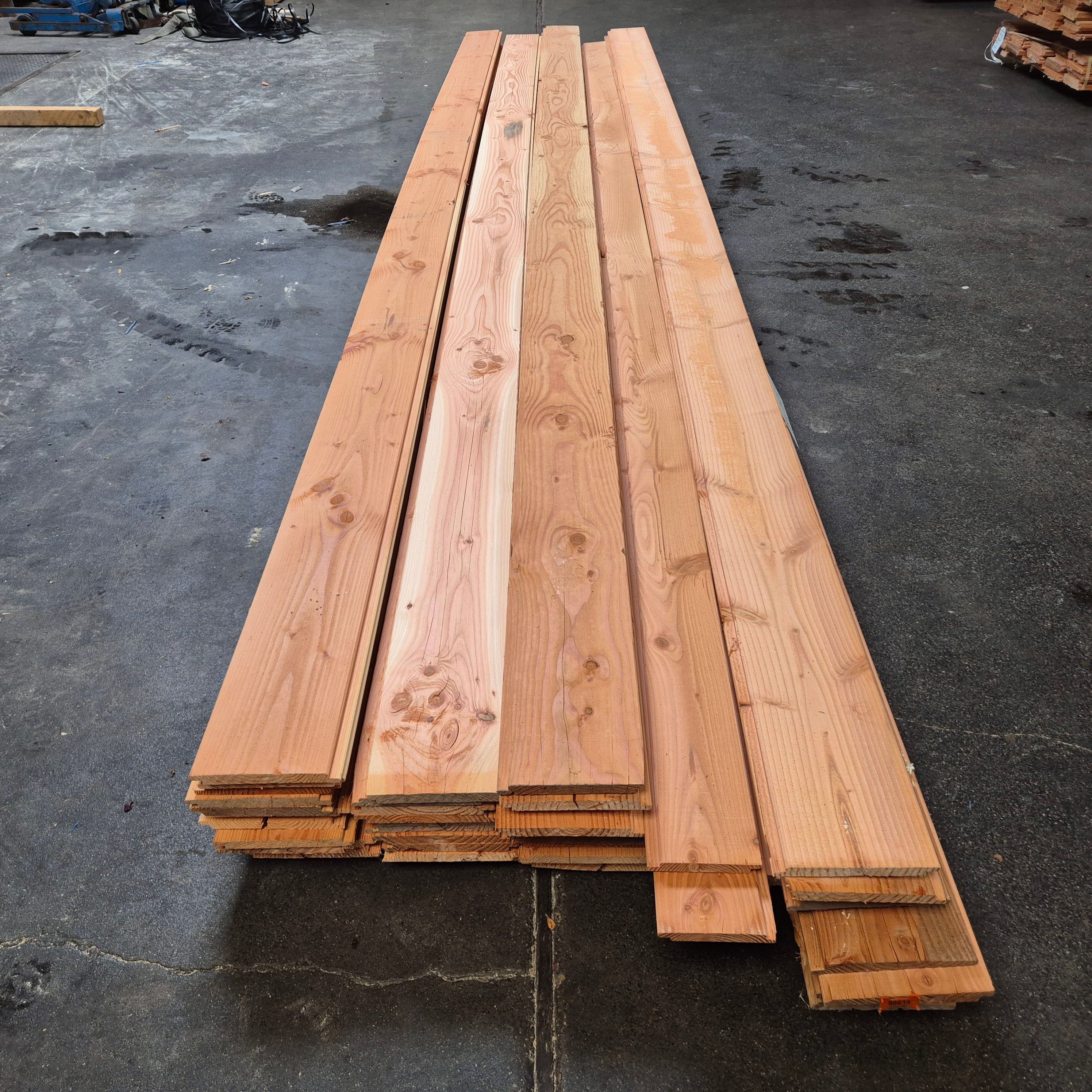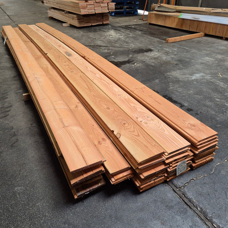 Een partij Douglas gevelbekleding met een Halfhouts Rabat profiel.