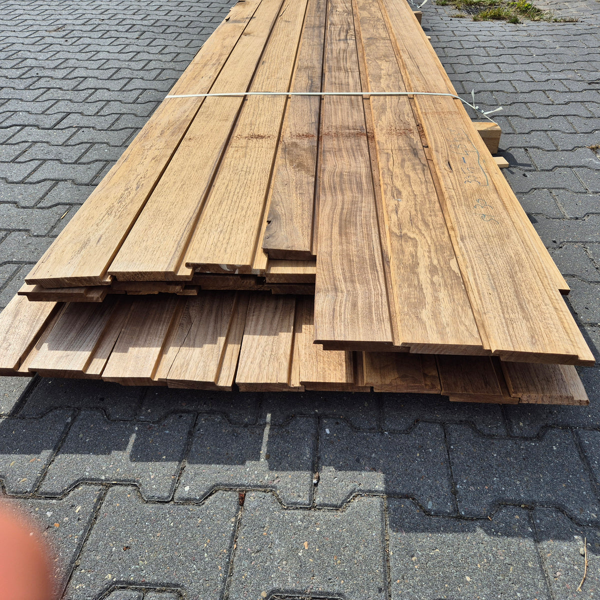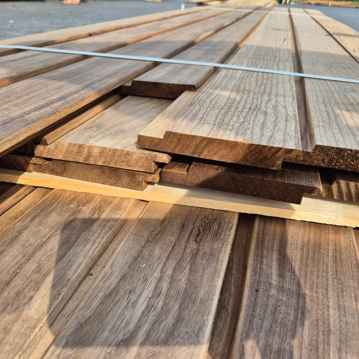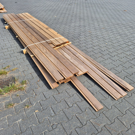 Partij Thermowood Frake gevelbekleding met Channelsiding profiel. Dit hout is Thermisch Gemodificeerd voor duurzaamheid en een warme uitstraling.