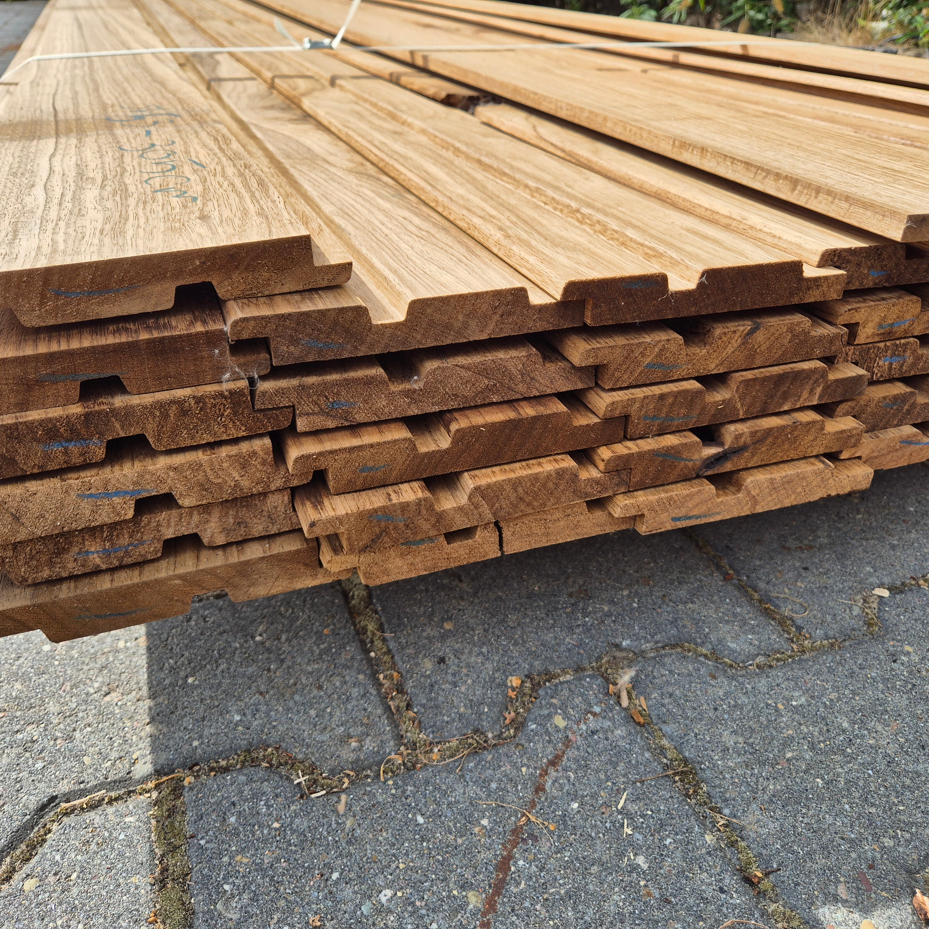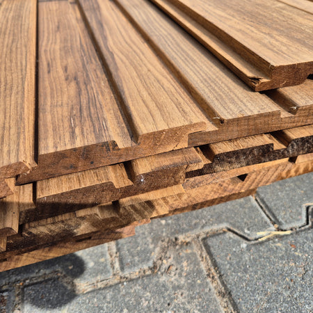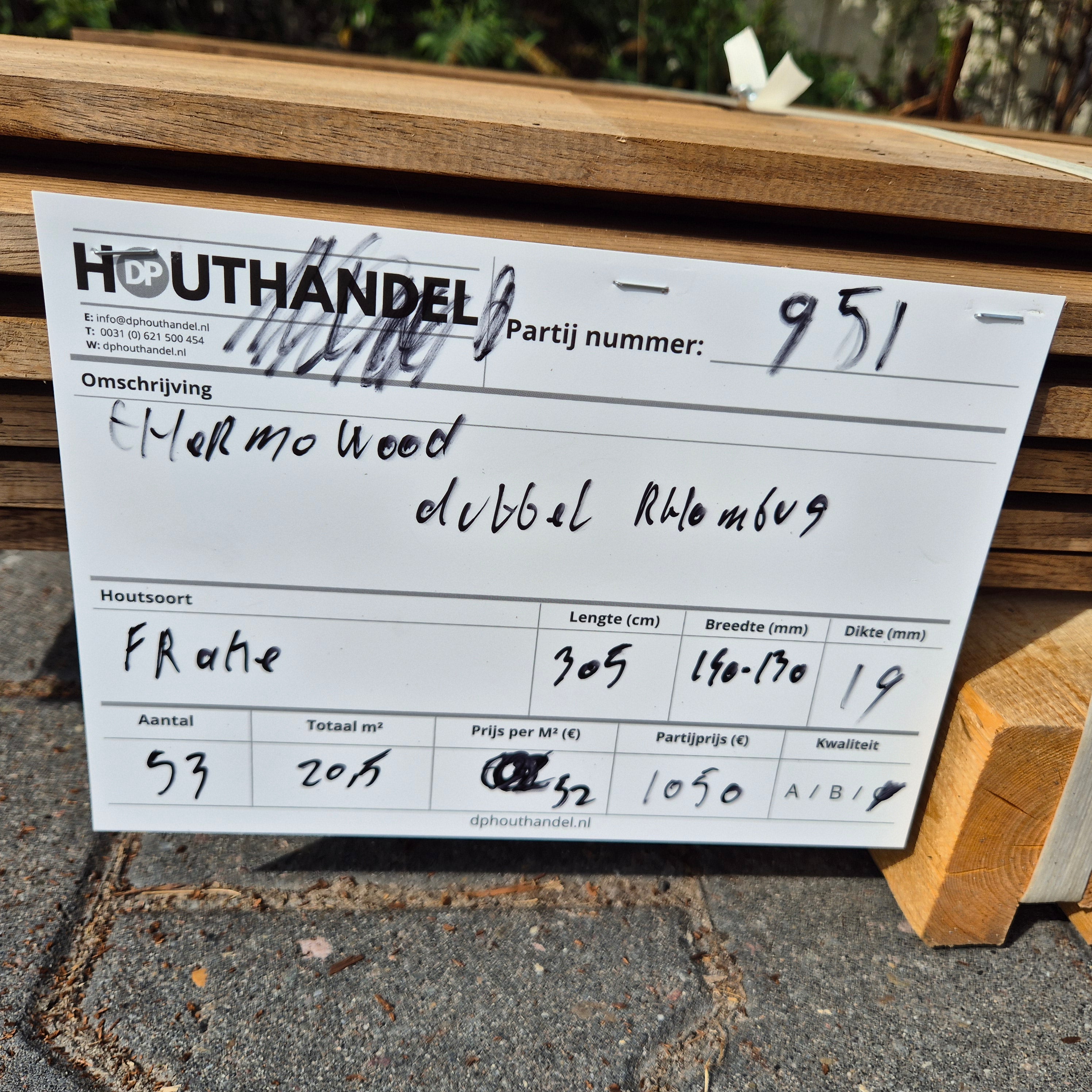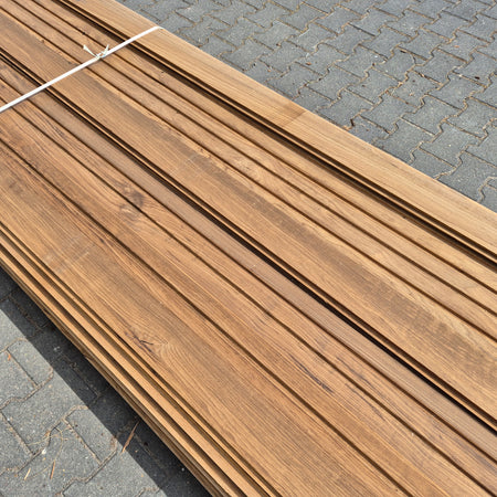 Partij Thermowood Frake gevelbekleding met een Dubbel Rhombus profiel. Dit hout is thermisch gemodificeerd voor duurzaamheid en een warme uitstraling.