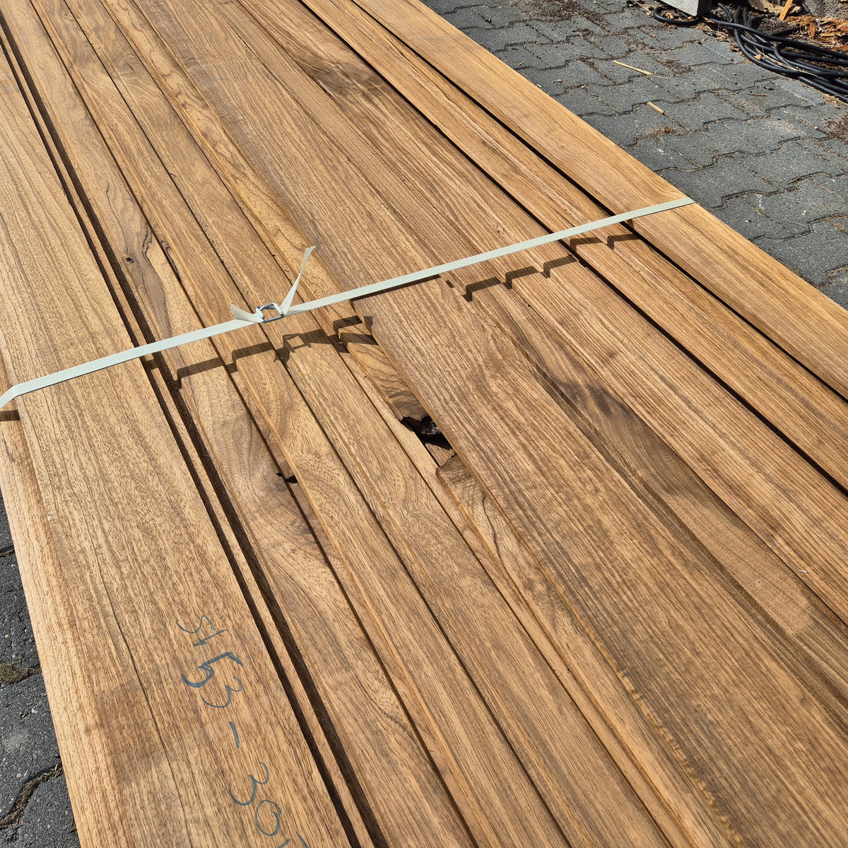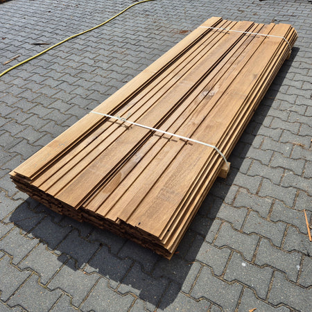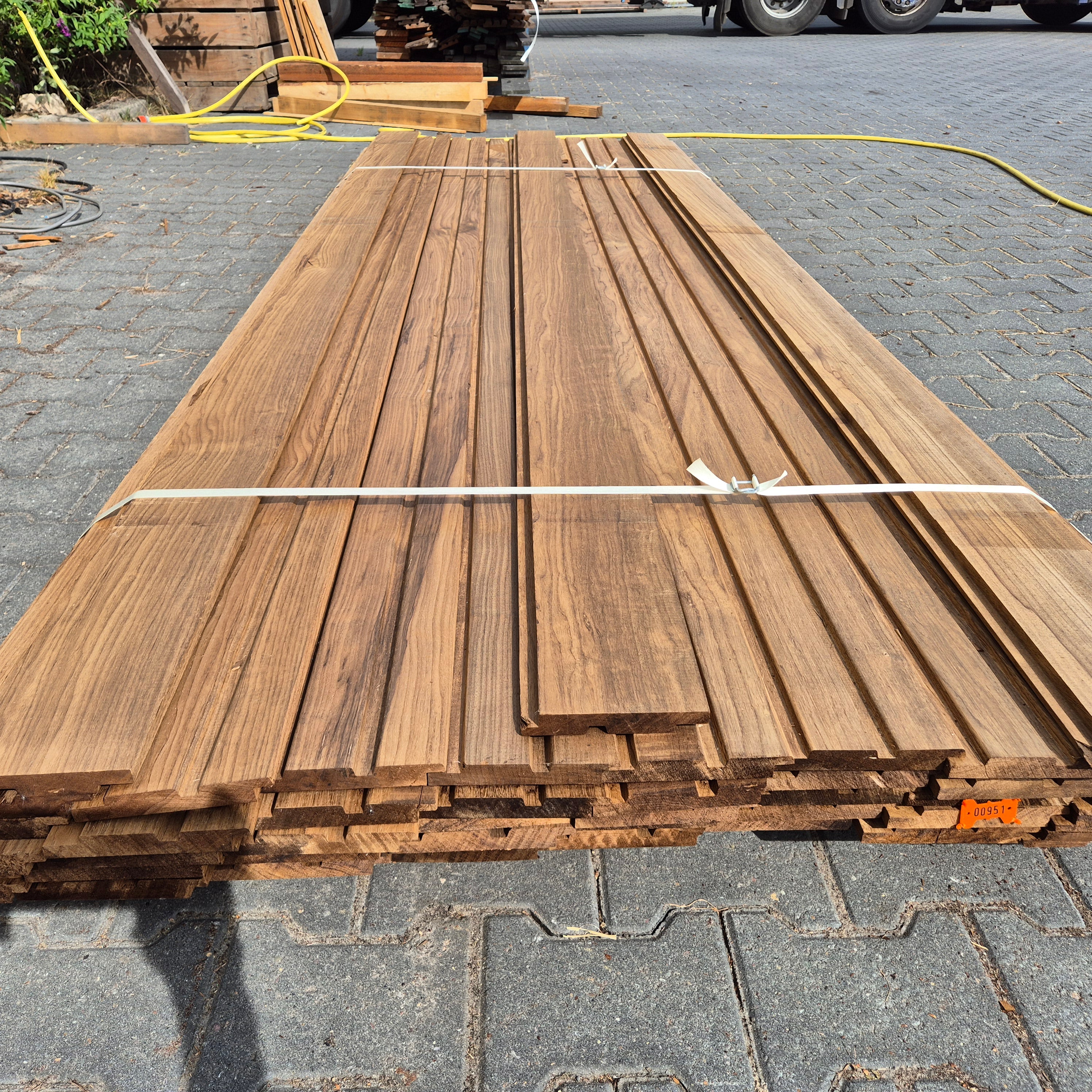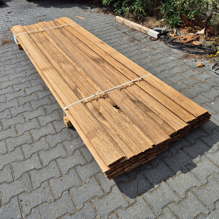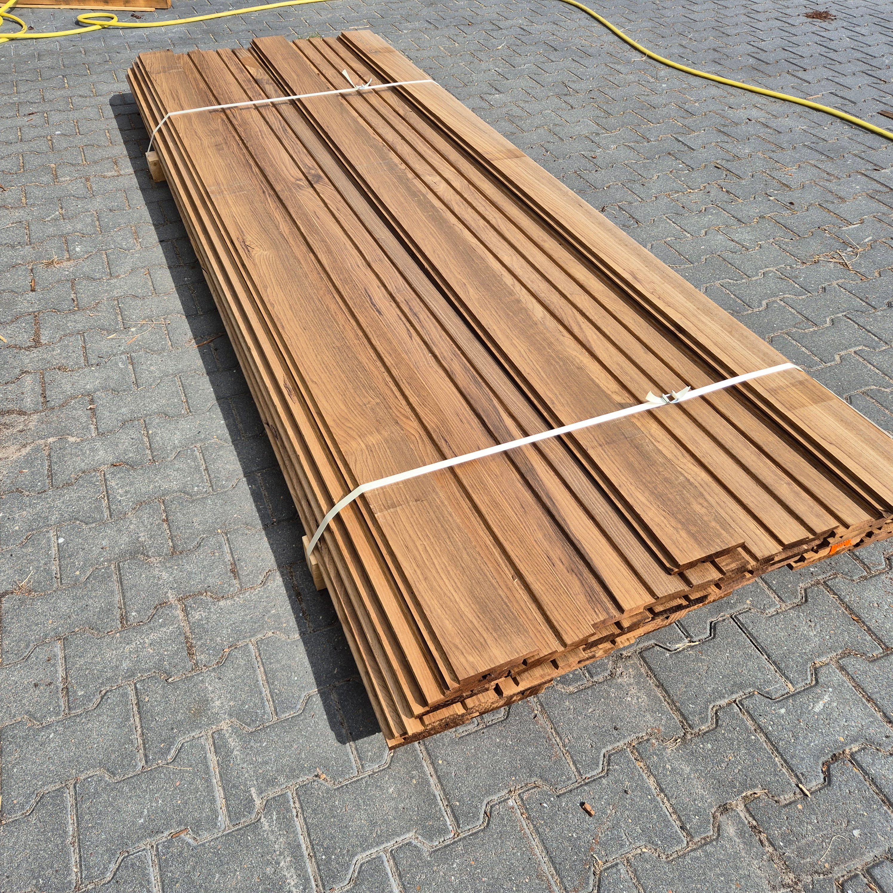 Partij Thermowood Frake gevelbekleding met een Dubbel Rhombus profiel. Dit hout is thermisch gemodificeerd voor duurzaamheid en een warme uitstraling.