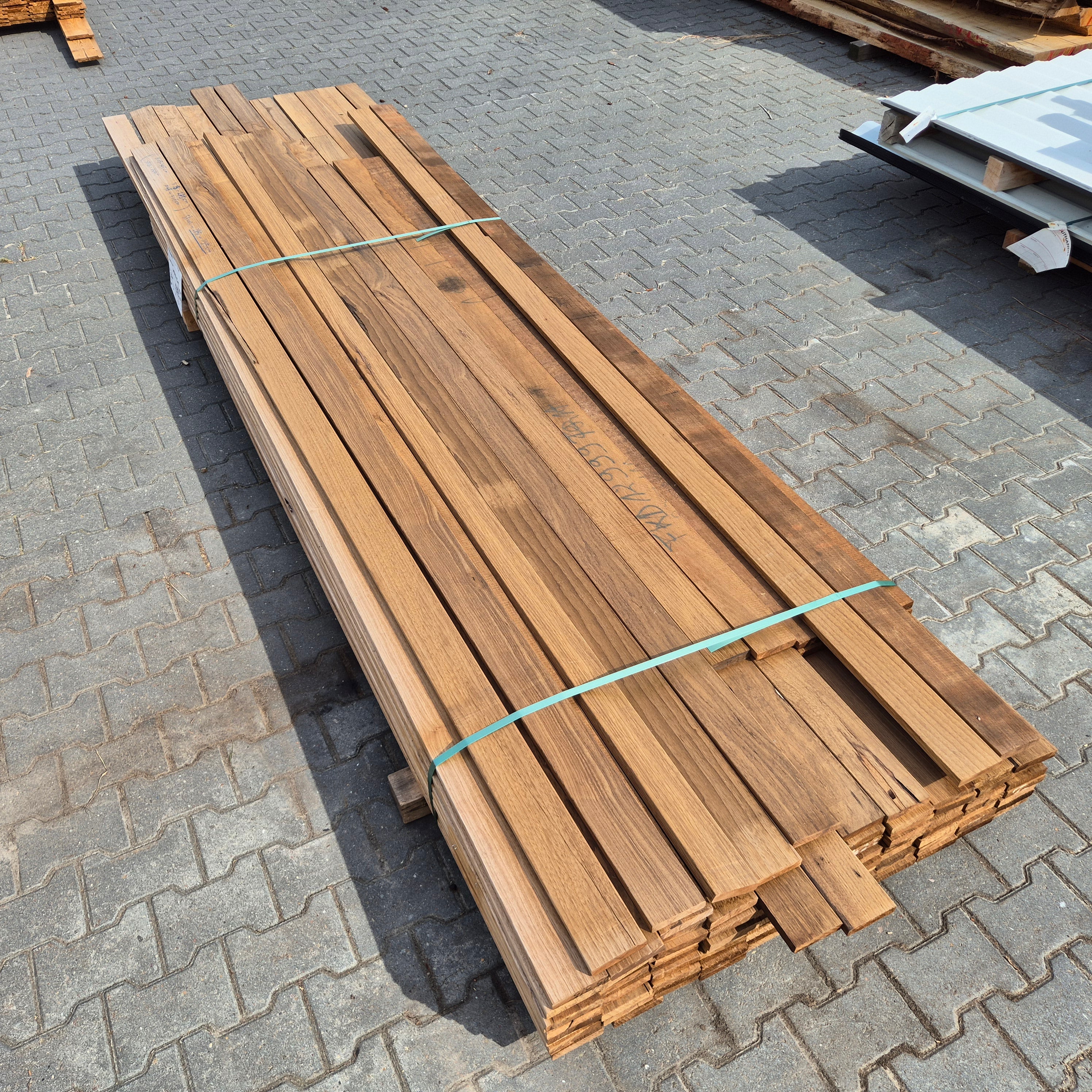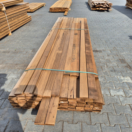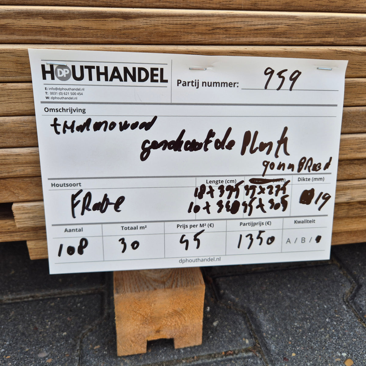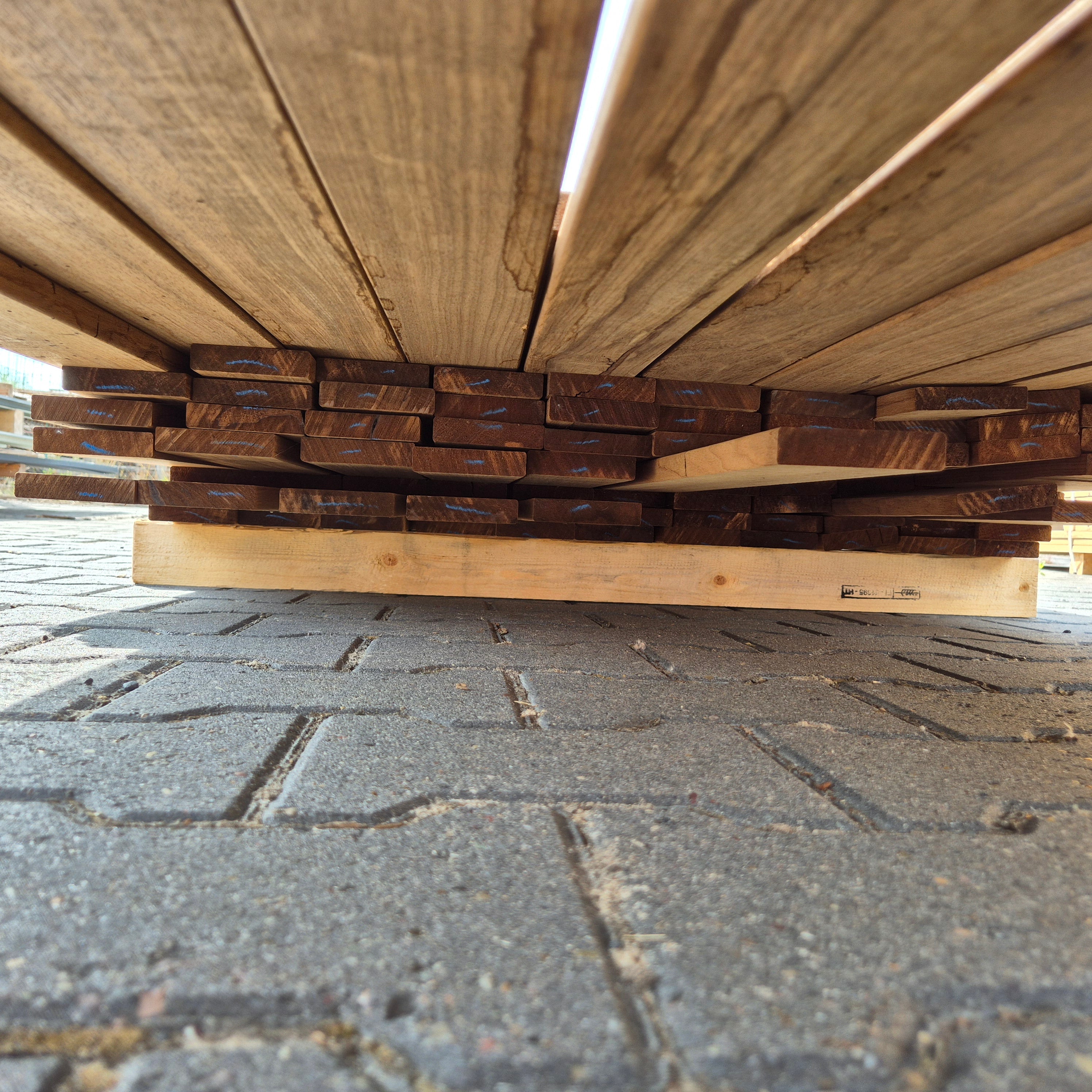 Partij Thermowood Frake Geschaafde Planken. Dit hout is thermisch gemodificeerd voor duurzaamheid en een warme uitstraling.