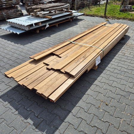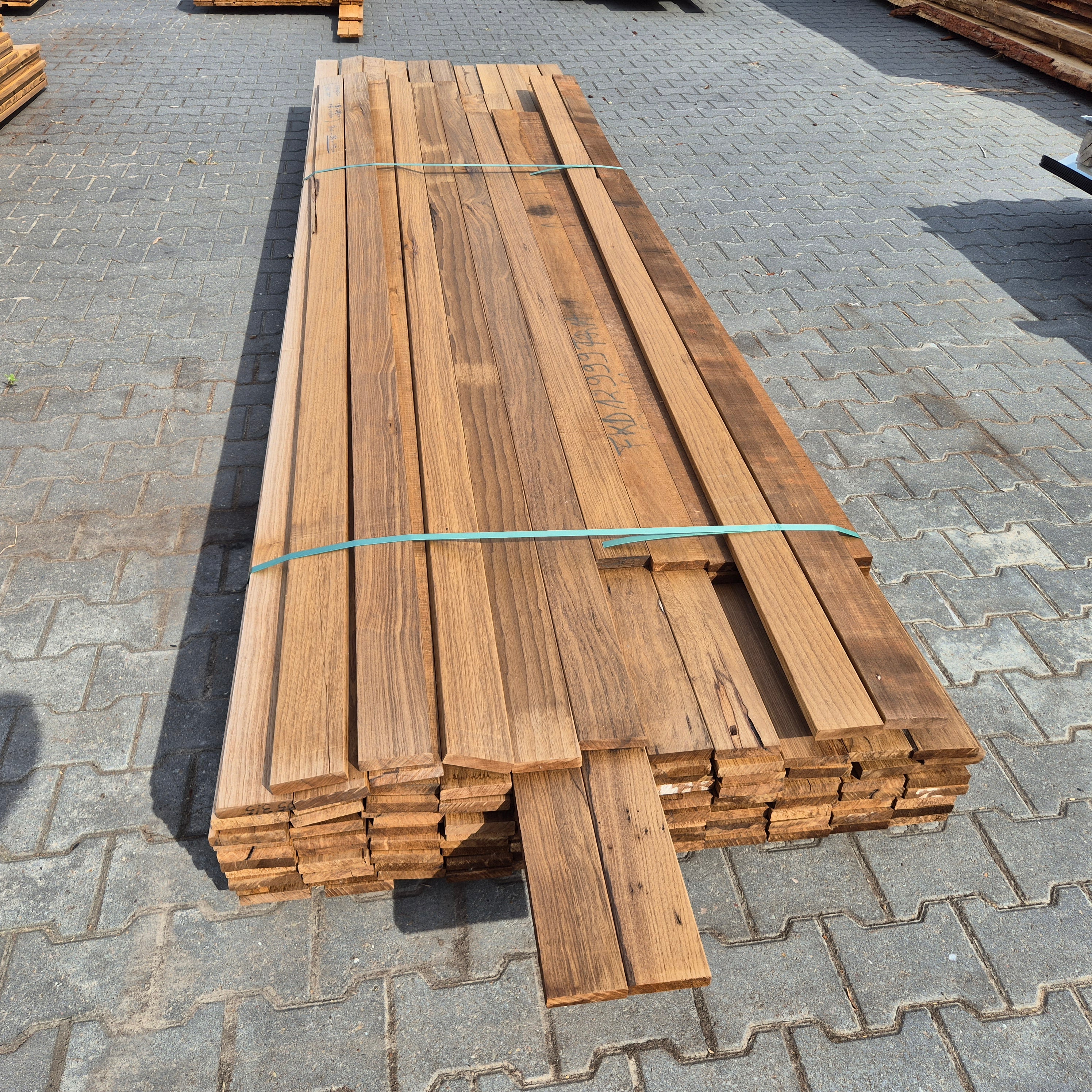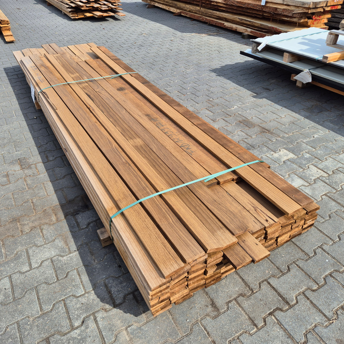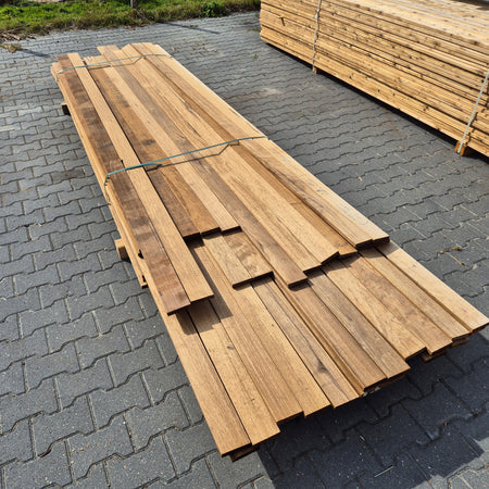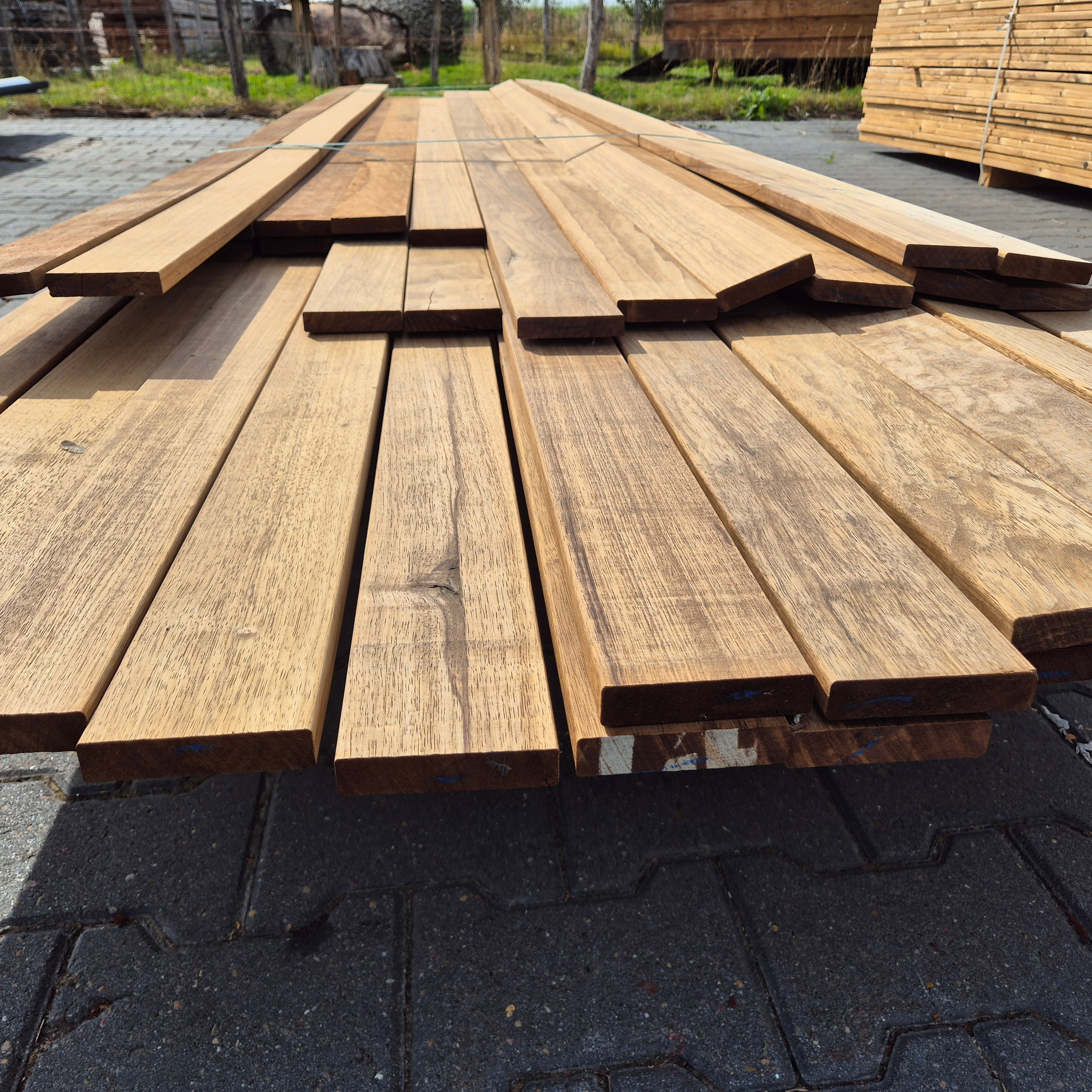 Partij Thermowood Frake Geschaafde Planken. Dit hout is thermisch gemodificeerd voor duurzaamheid en een warme uitstraling.