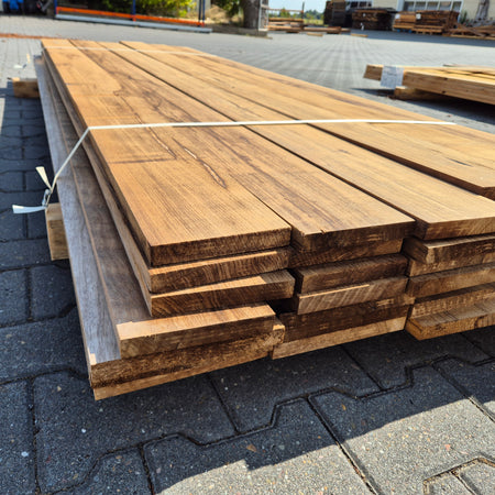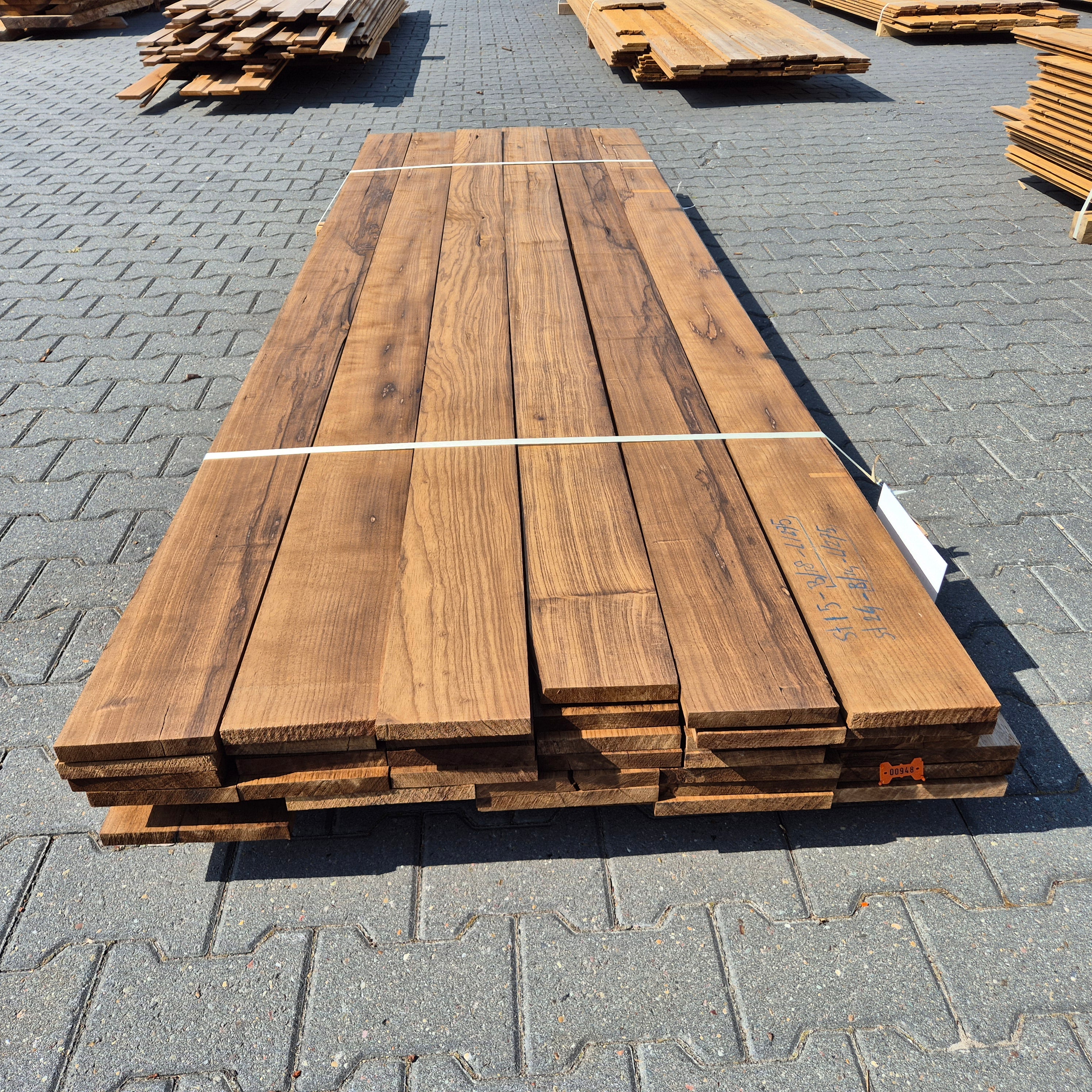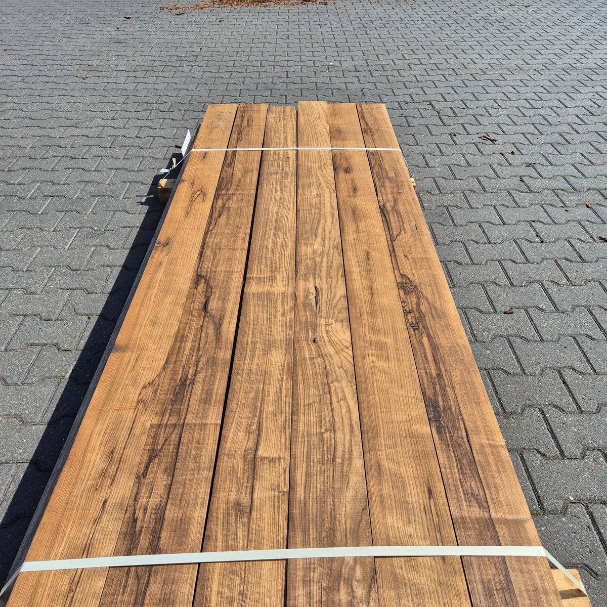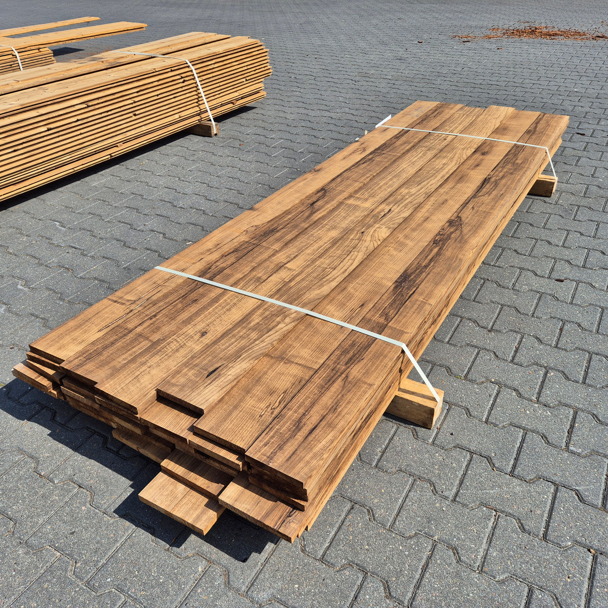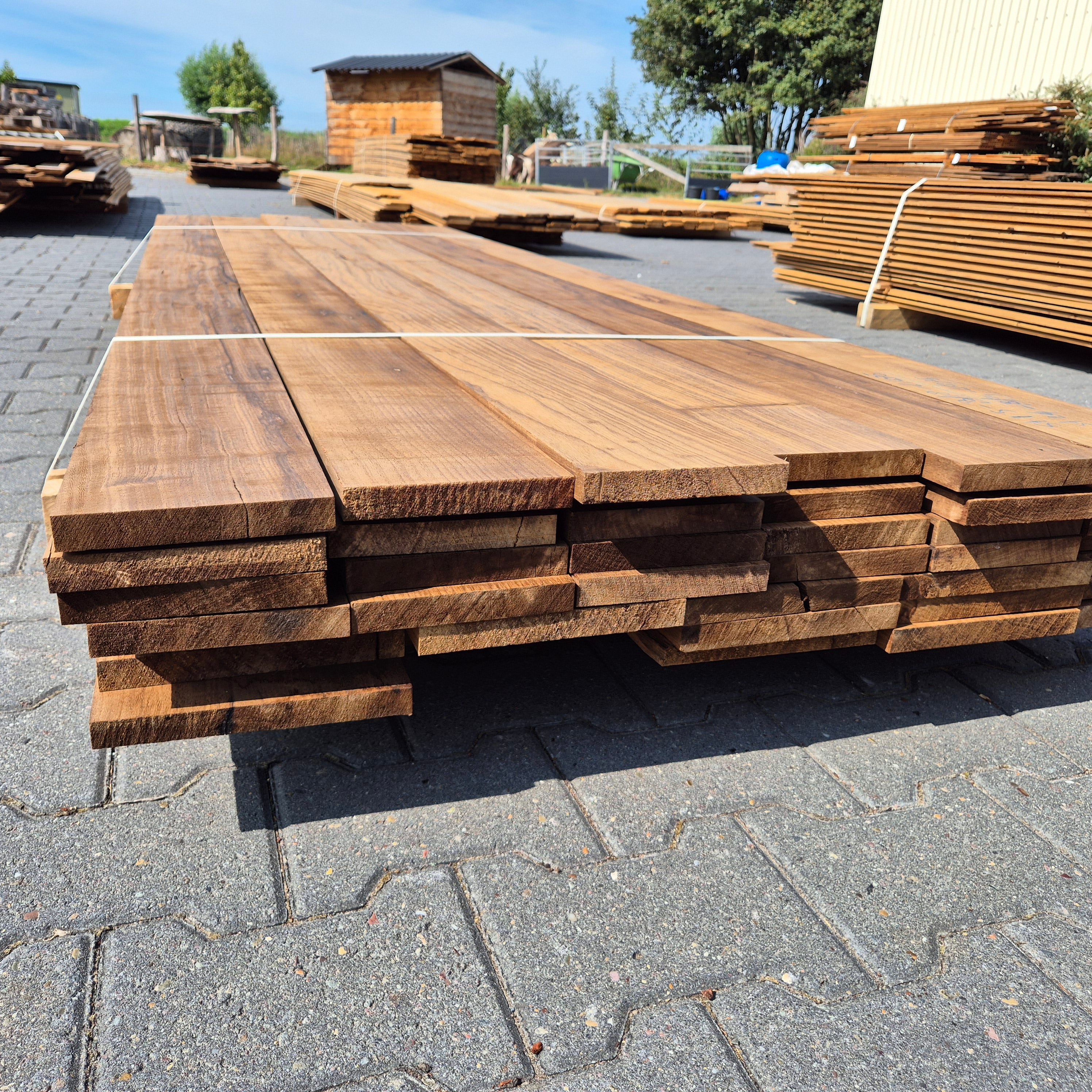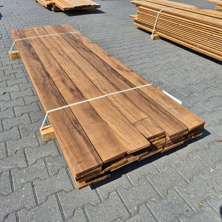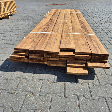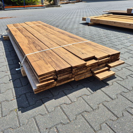Partij Thermowood Frake planken met een geschaafde afwerking. Dit hout is thermisch gemodificeerd voor duurzaamheid en een warme uitstraling.