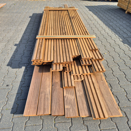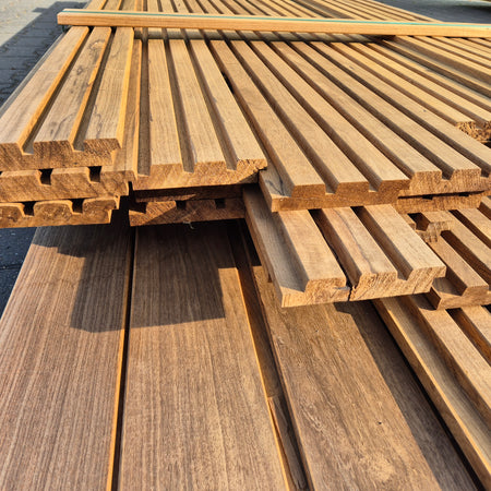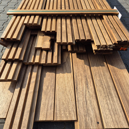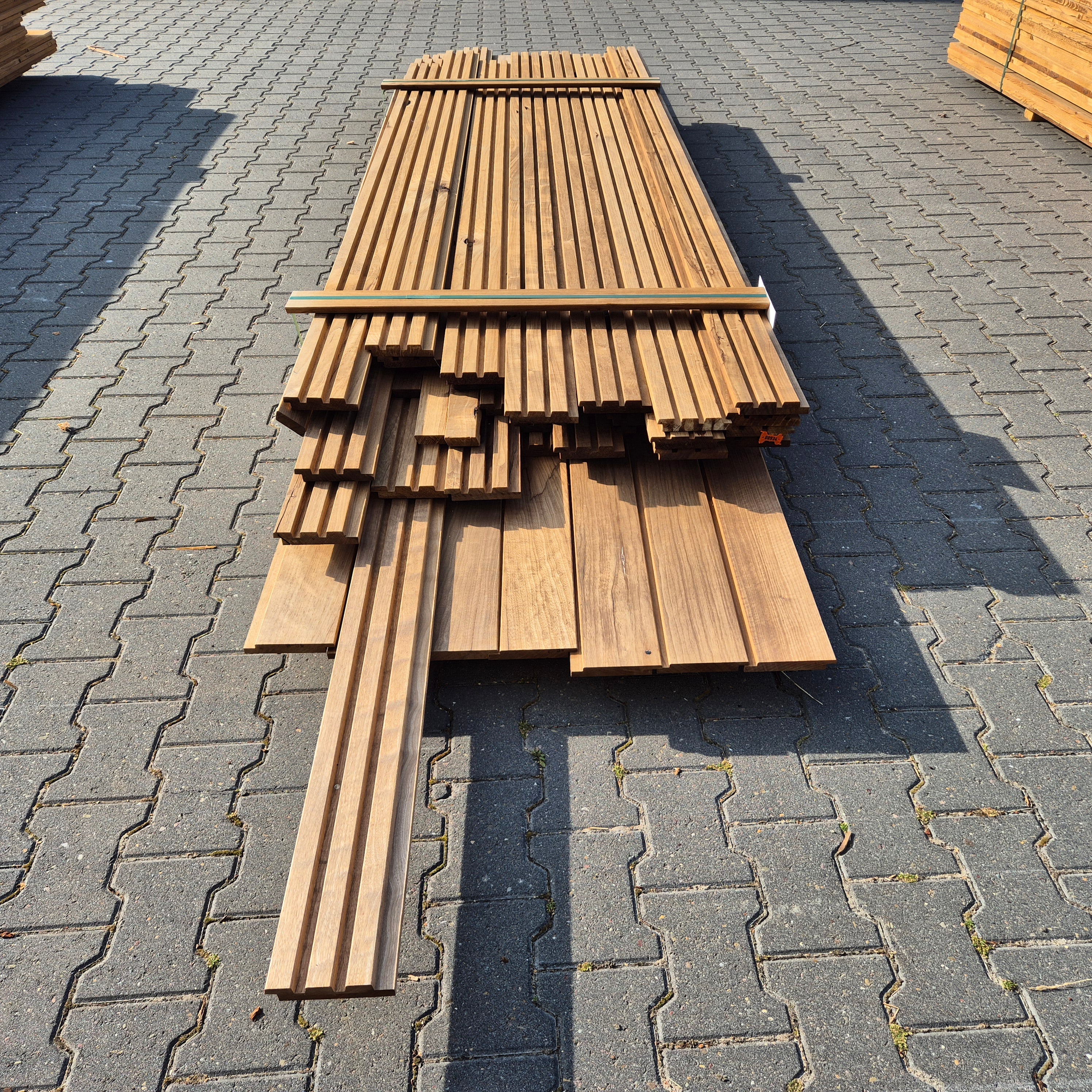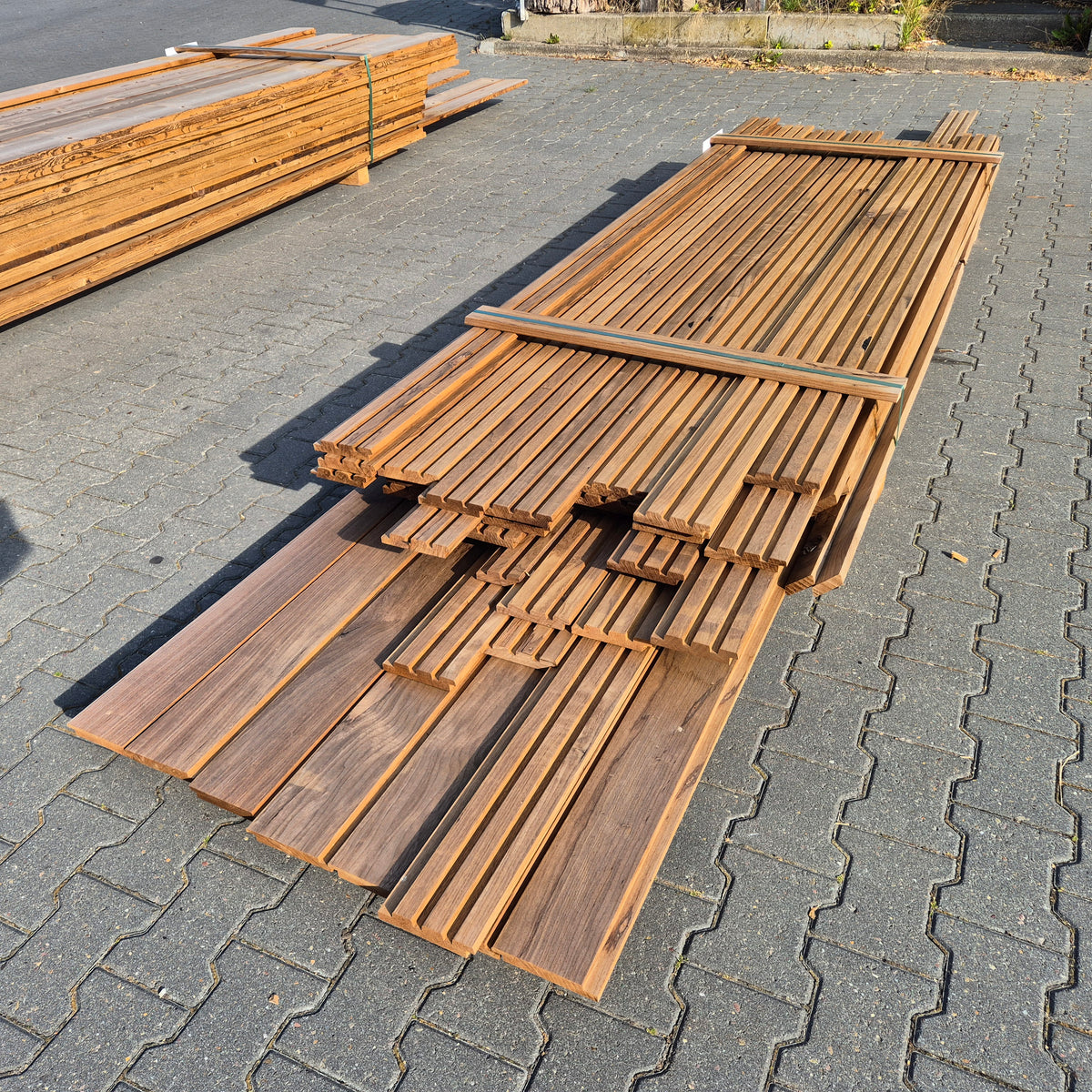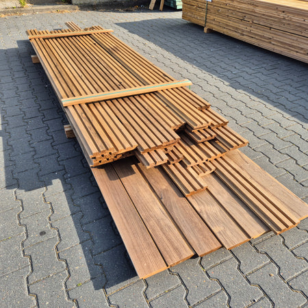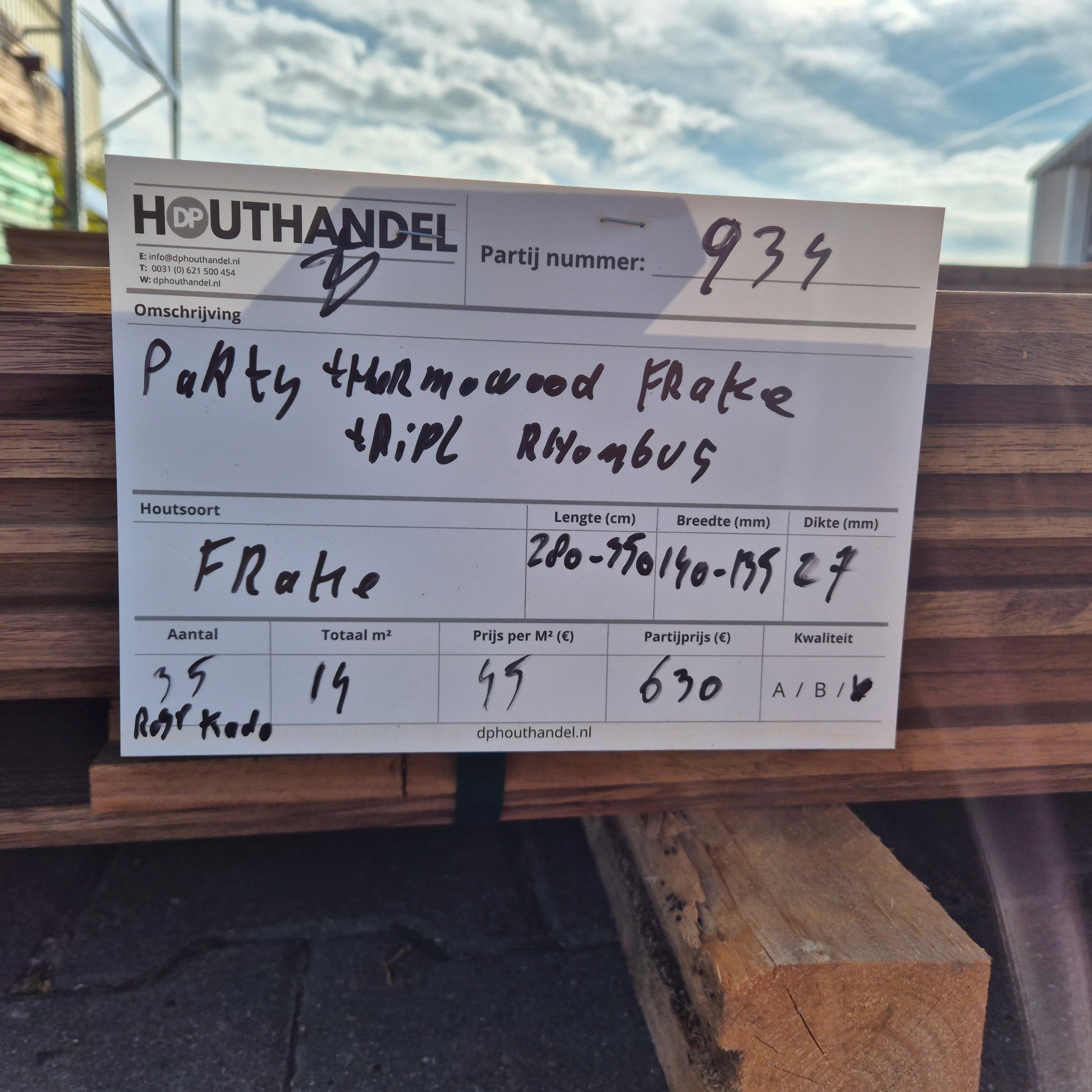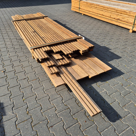 Een partij Thermo Frake Gevelbekleding met Triple Rhombus planken. Deze planken zijn thermisch gemodificeerd voor hun duurzaamheid en warme uitstraling.