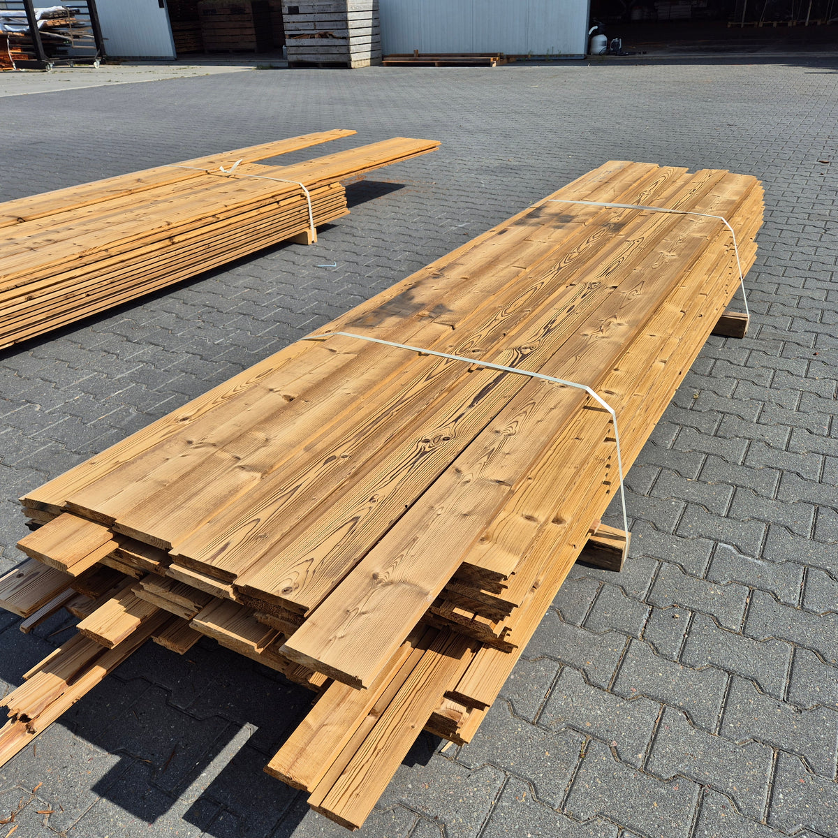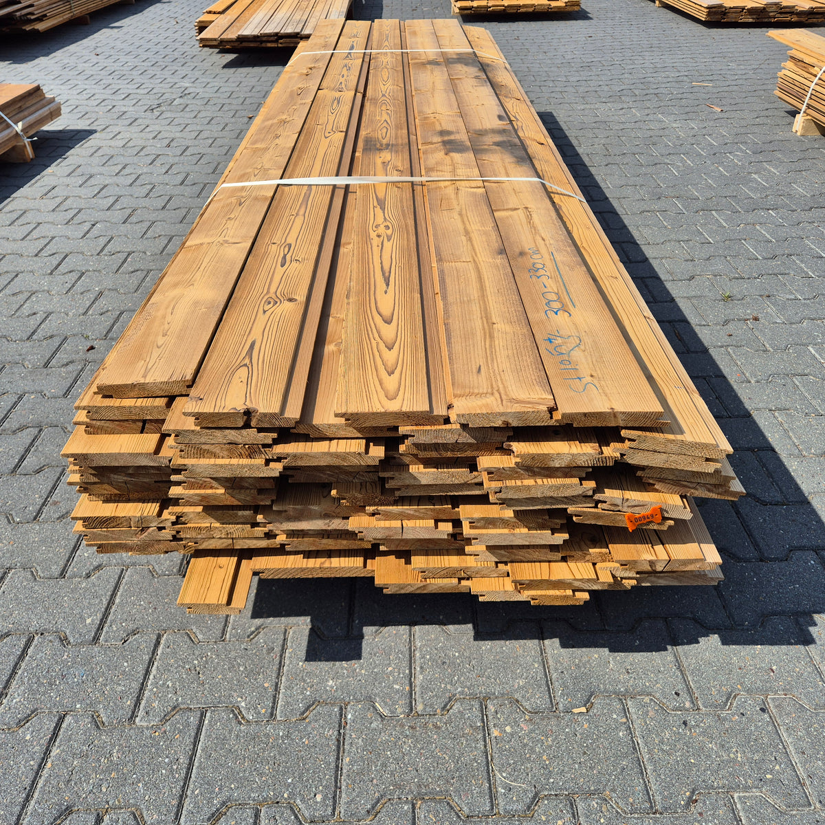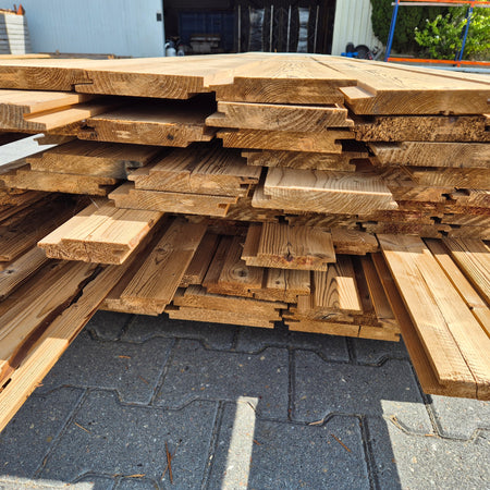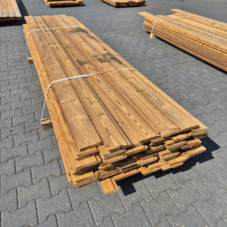 Partij Thermowood Vuren gevelbekleding met een Channelsiding profiel. Dit hout is thermisch gemodificeerd voor duurzaamheid en een warme uitstraling.