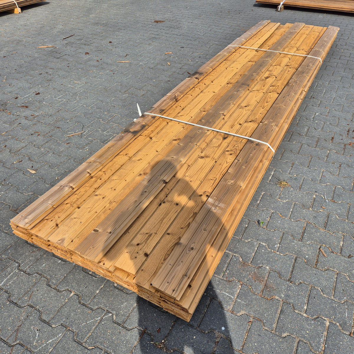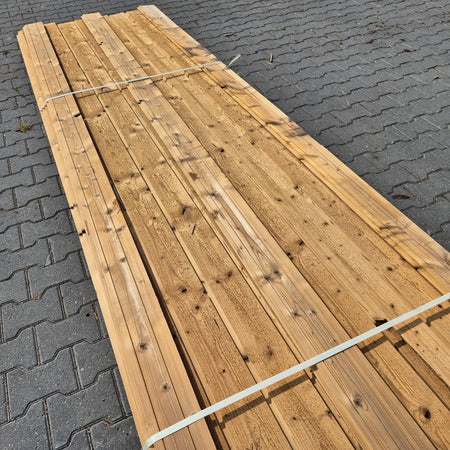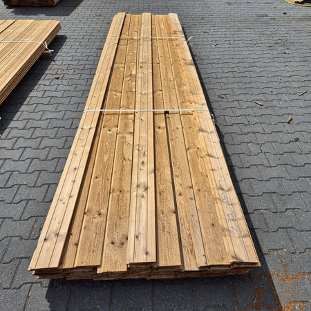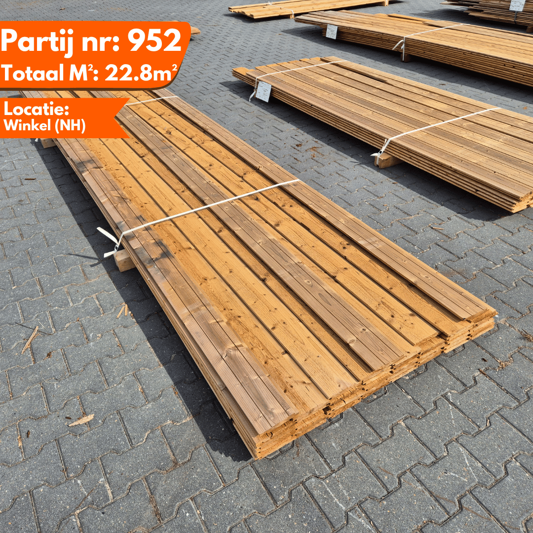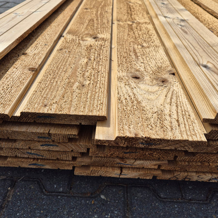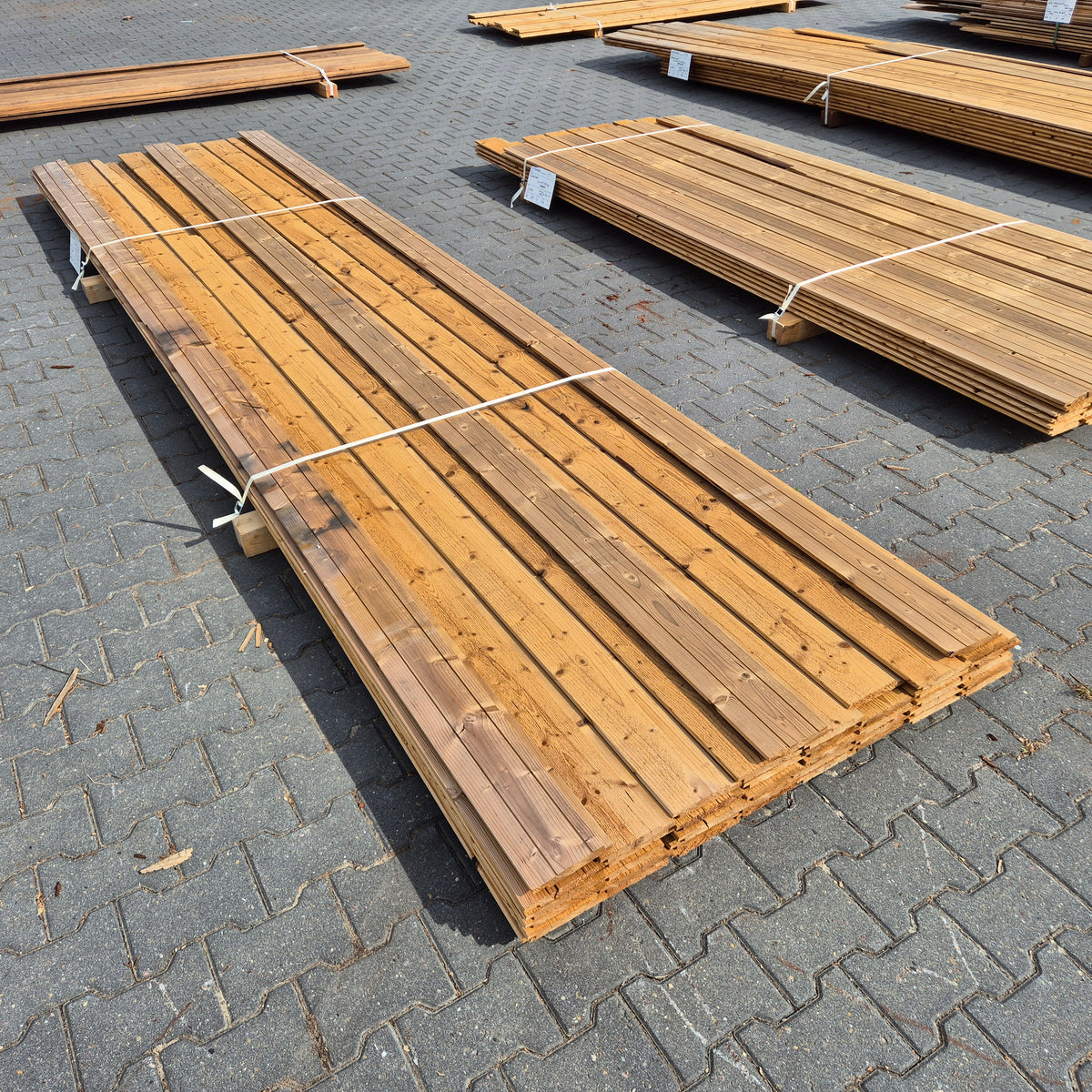 Partij Thermowood Vuren planken met een channelsiding profiel en geborstelde afwerking. Dit hout is Thermisch Gemodificeerd voor duurzaamheid en een warme uitstraling.
