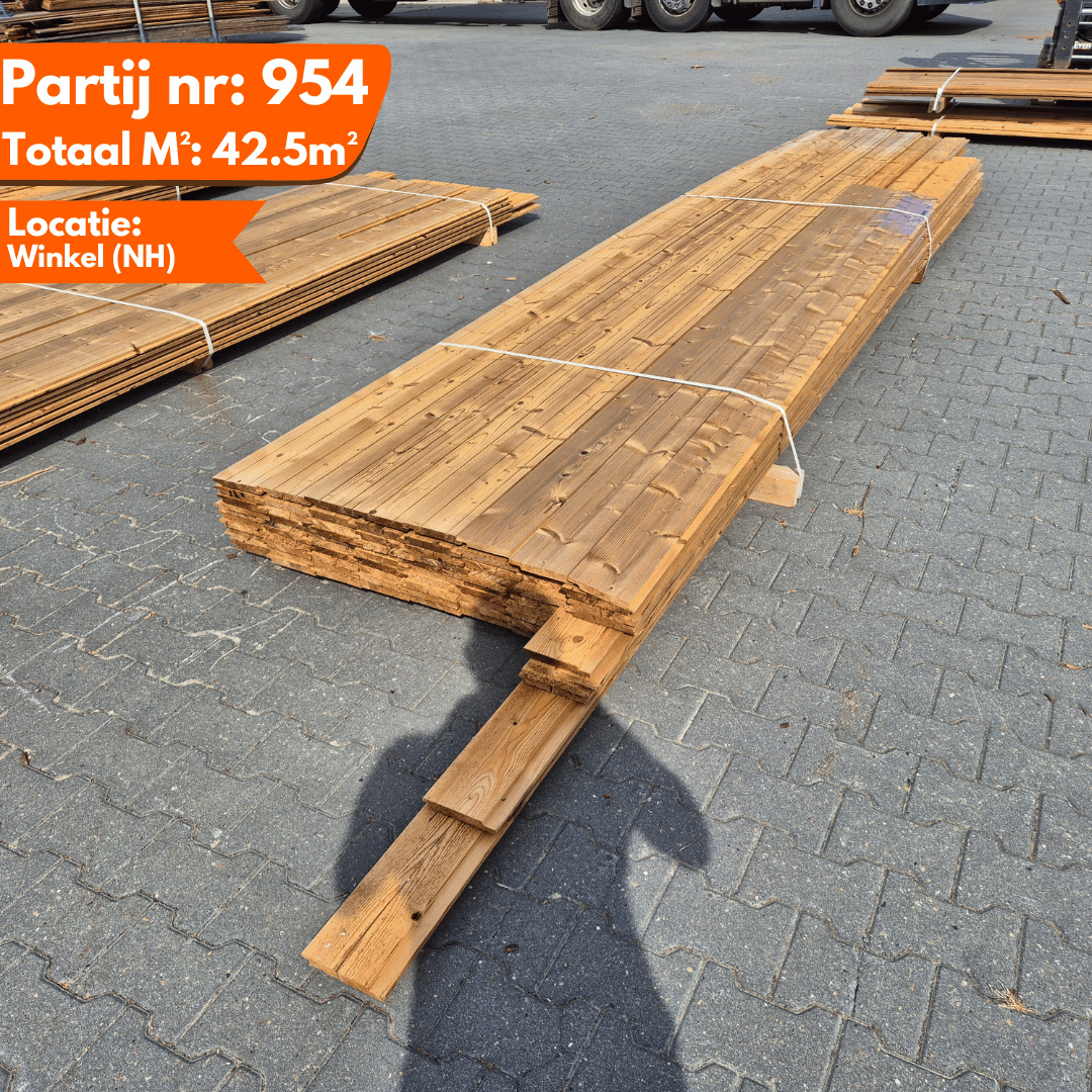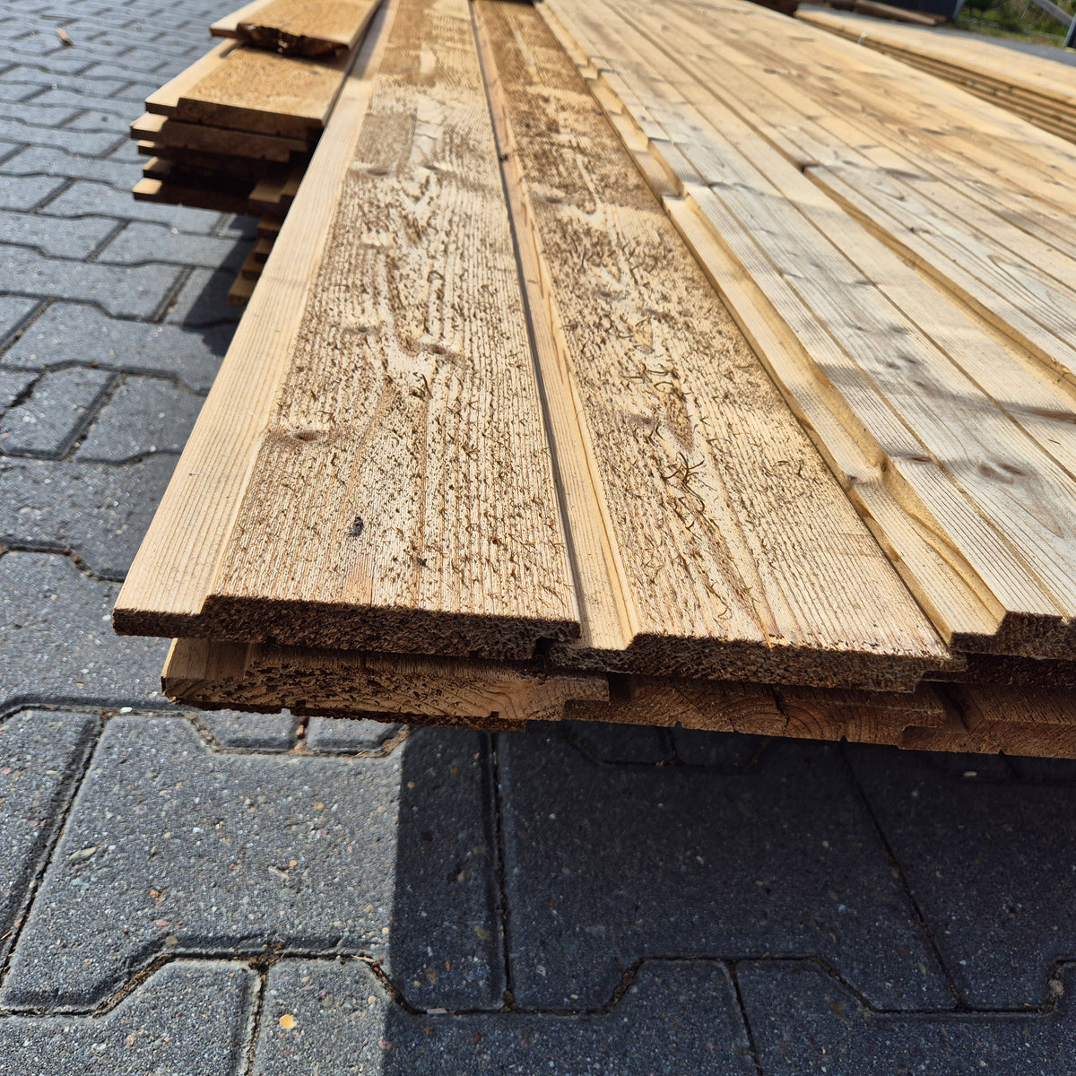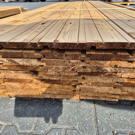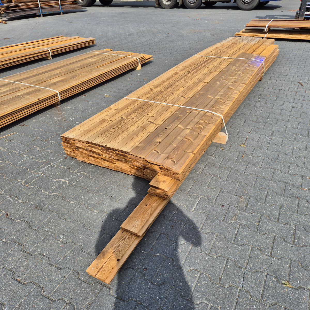 Partij Thermowood Vuren planken met een channelsiding profiel en geborstelde afwerking. Dit hout is Thermisch Gemodificeerd voor duurzaamheid en een warme uitstraling.