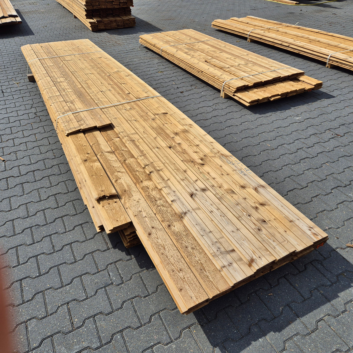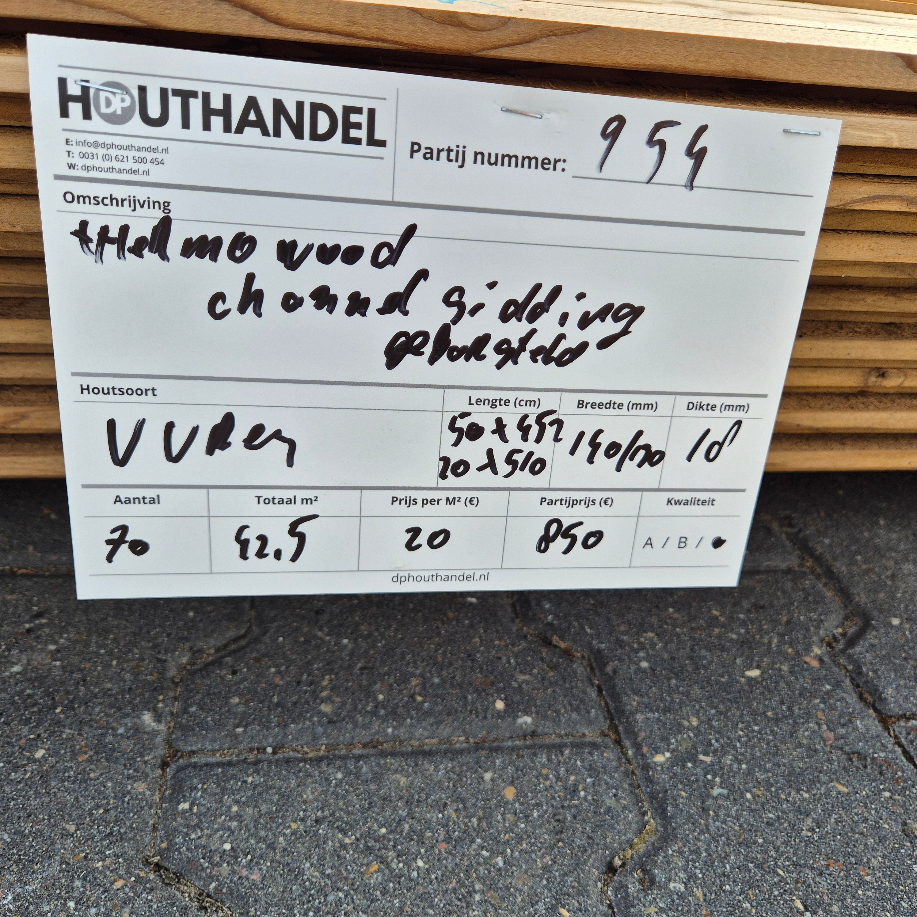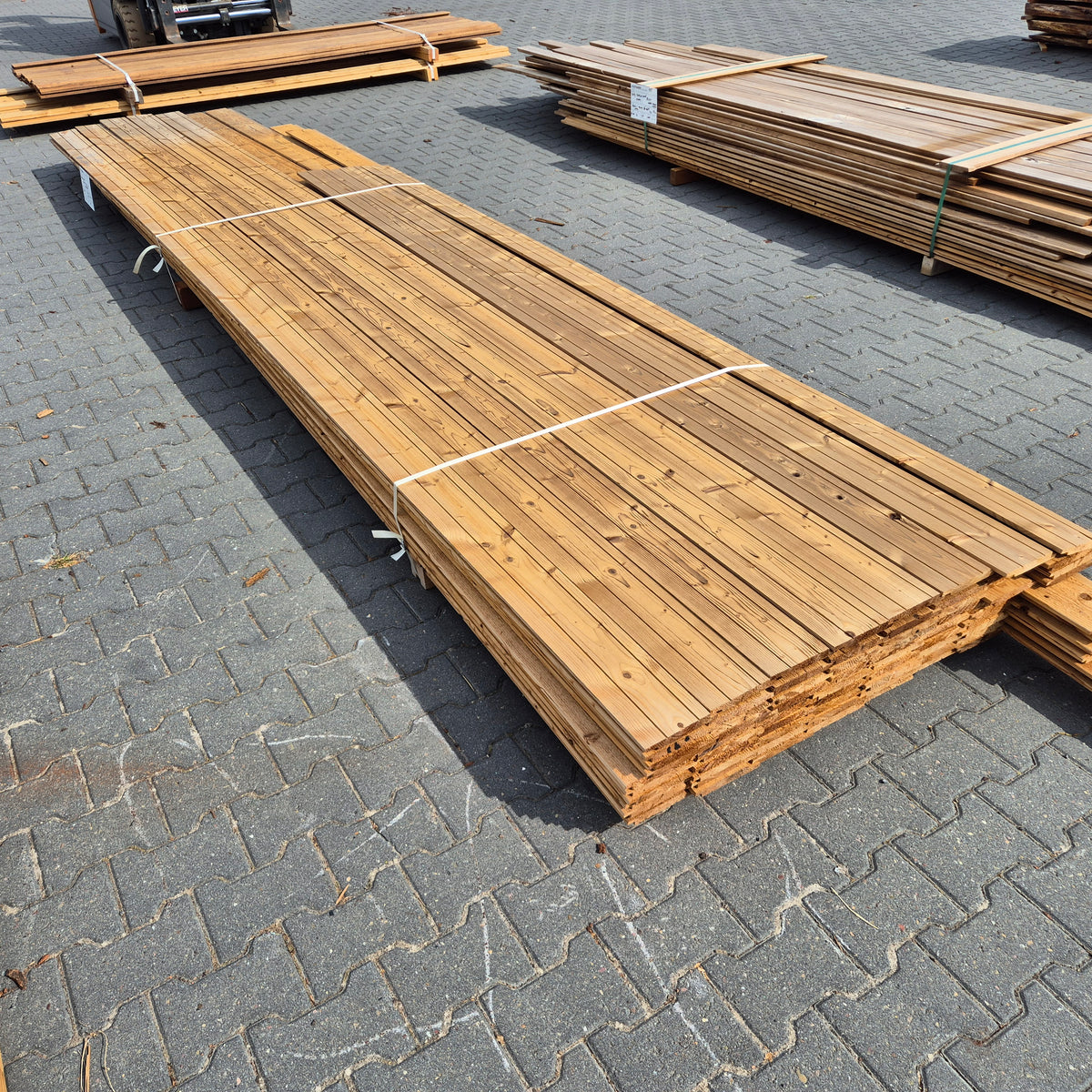 Partij Thermowood Vuren planken met een channelsiding profiel en geborstelde afwerking. Dit hout is Thermisch Gemodificeerd voor duurzaamheid en een warme uitstraling.