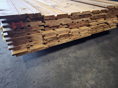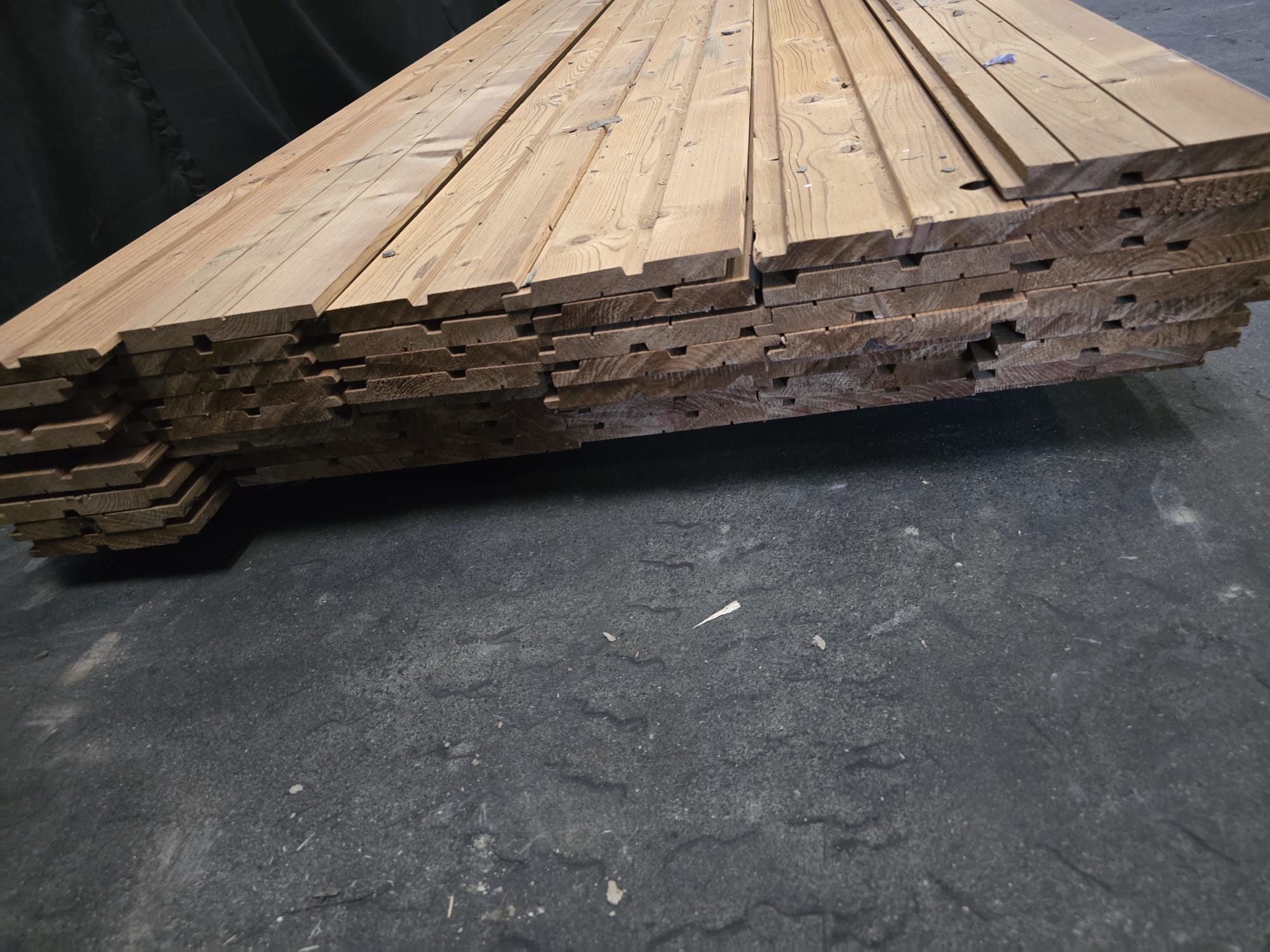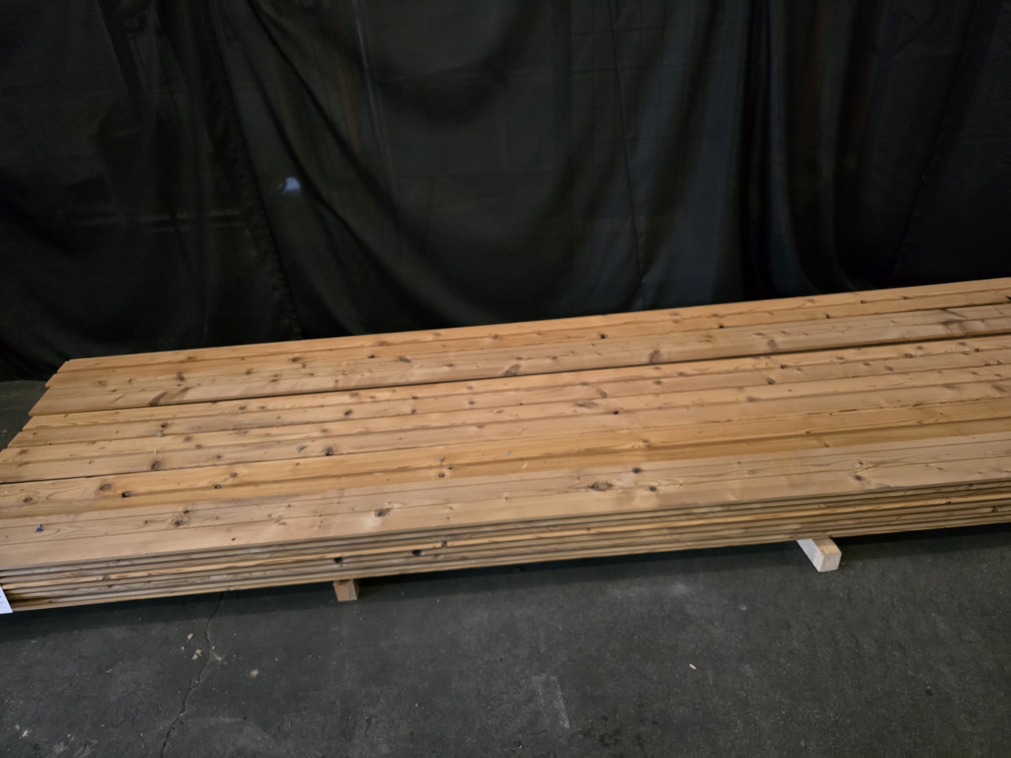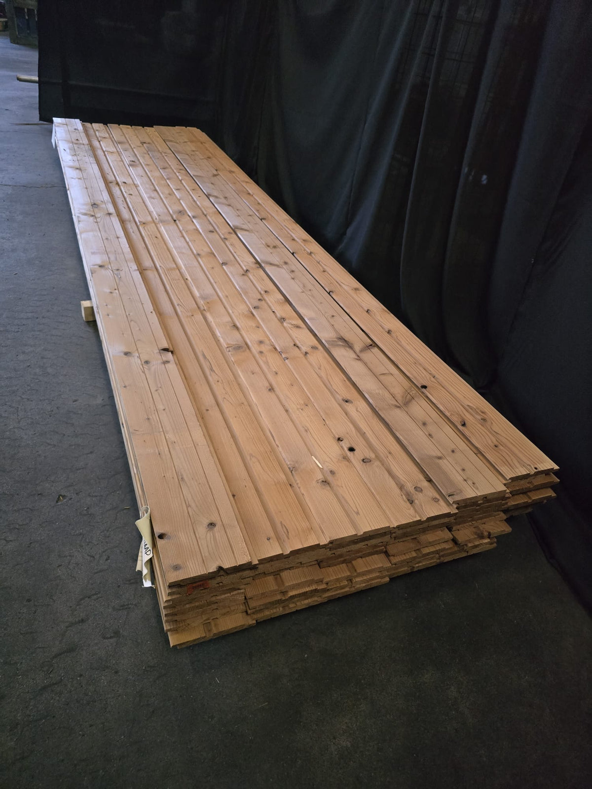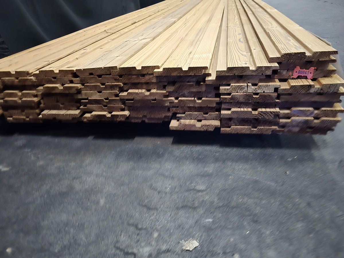 Partij Thermowood Vuren gevelbekleding met Dubbel Rhombus profiel. Dit hout is Thermisch Gemodificeerd voor duurzaamheid en een warme uitstraling.