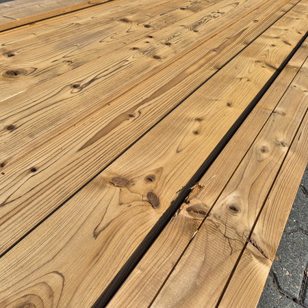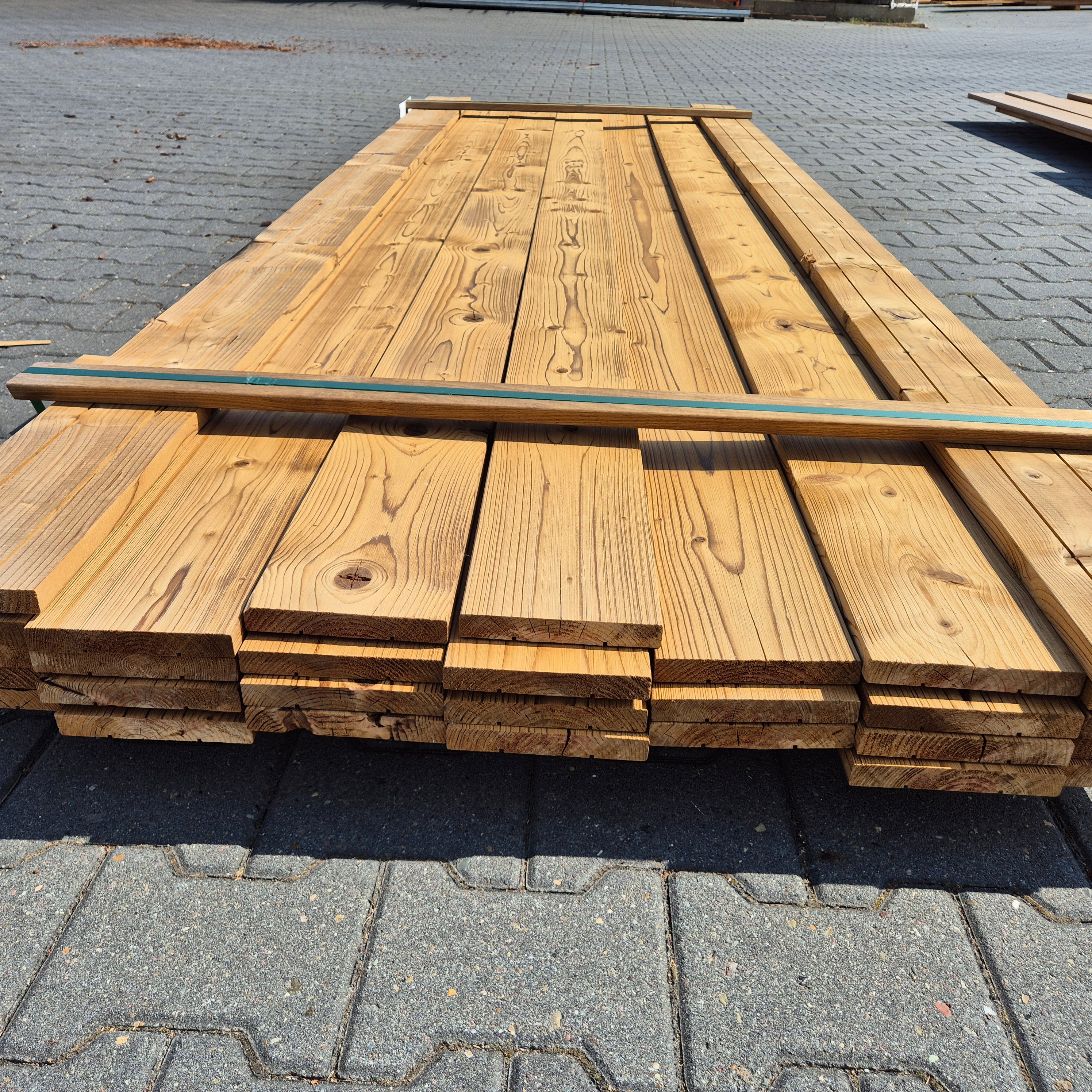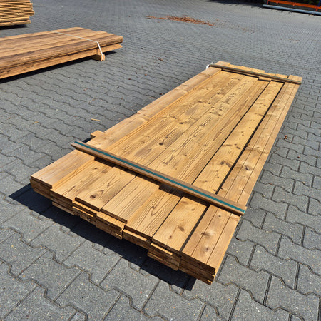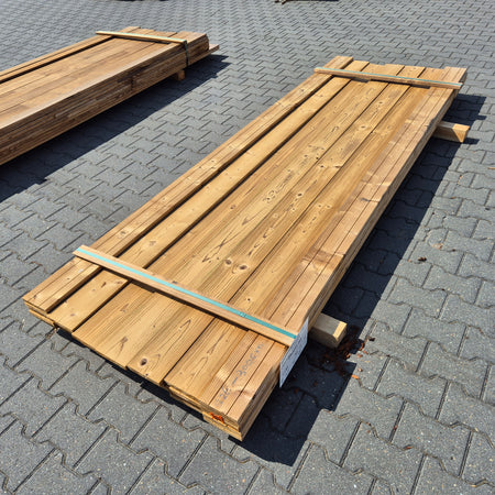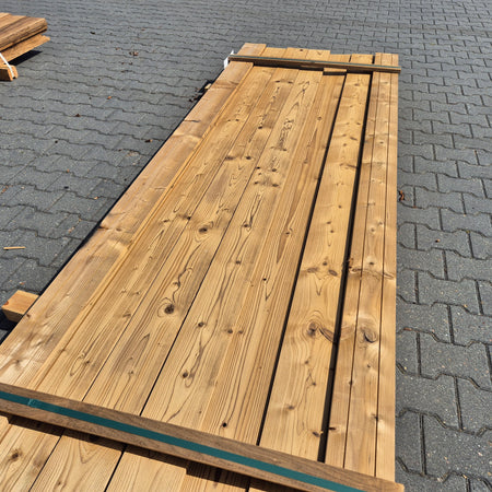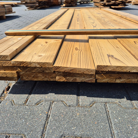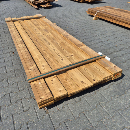 Partij Thermowood Vuren planken met een geborstelde afwerking. Dit hout is thermisch gemodificeerd voor duurzaamheid en een warme uitstraling.