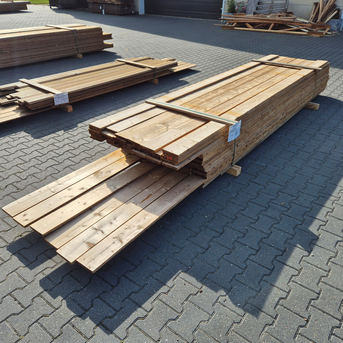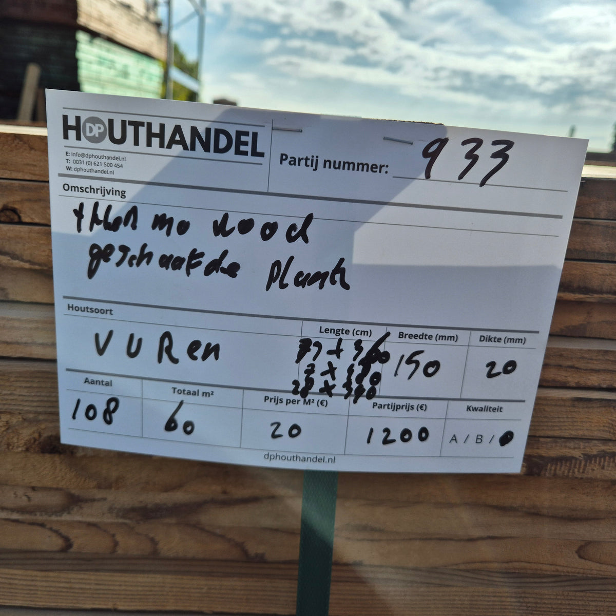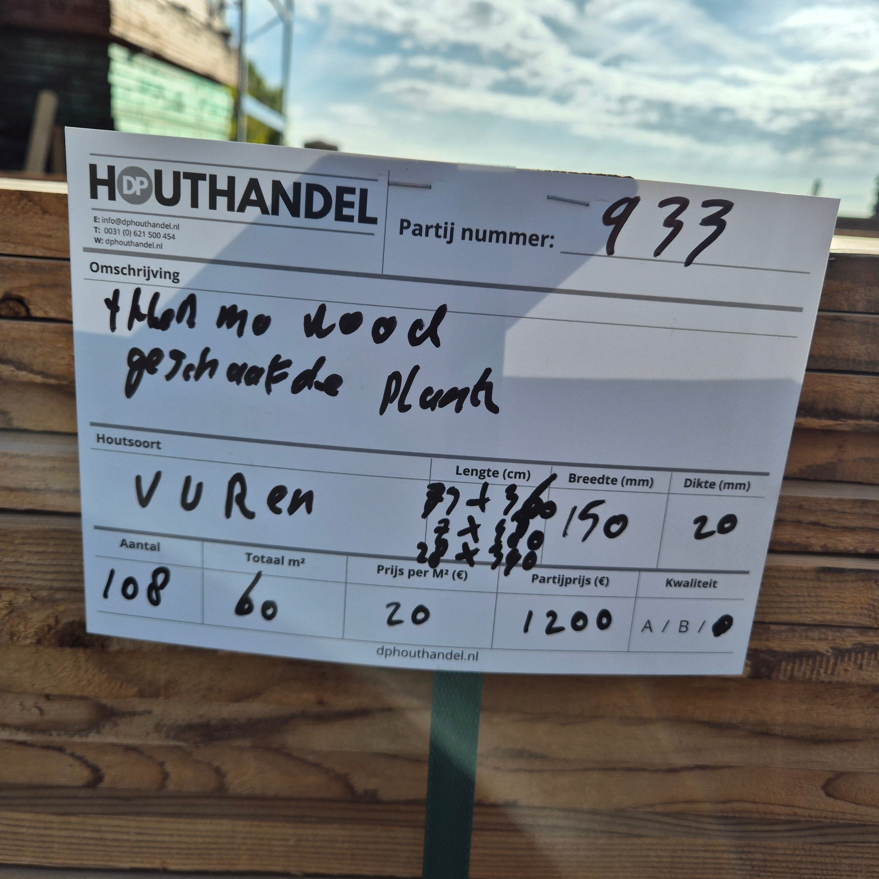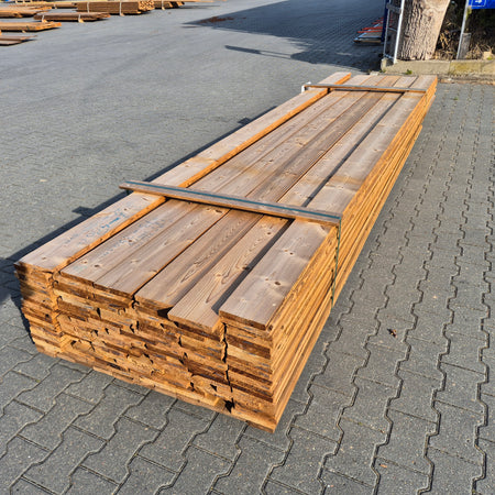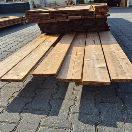 Een partij Thermo Vuren Geschaafde Planken. Deze planken zijn thermisch gemodificeerd voor hun duurzaamheid en warme uitstraling.
