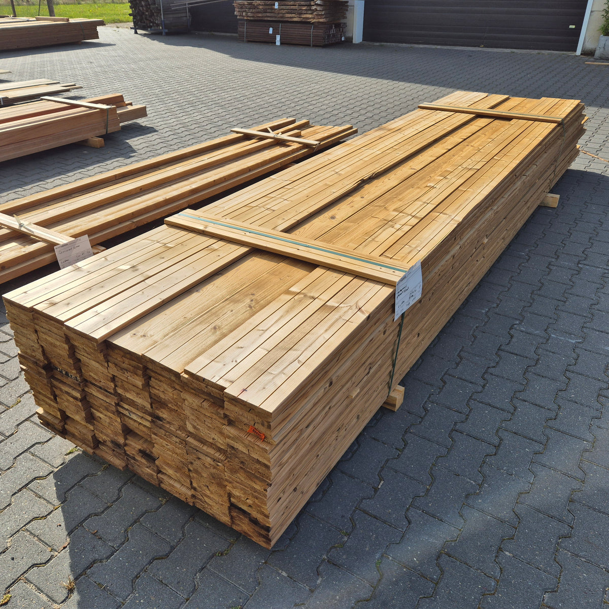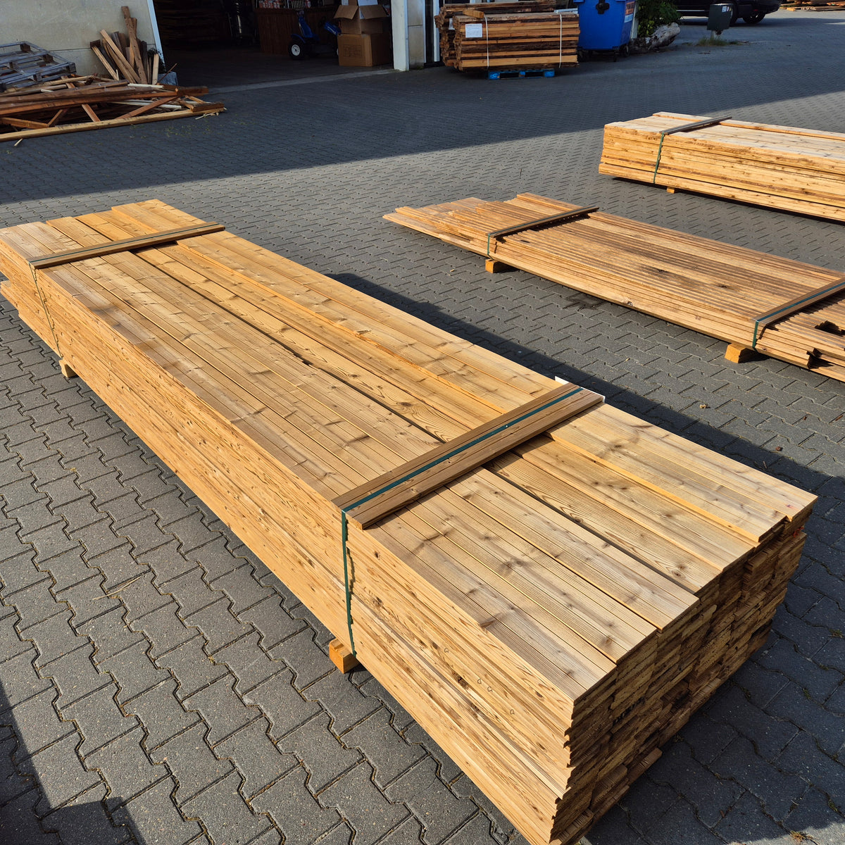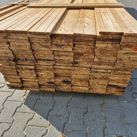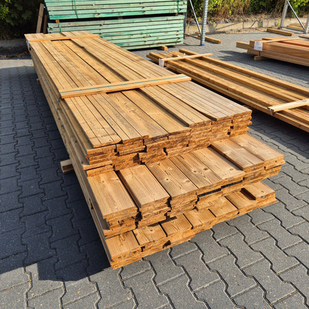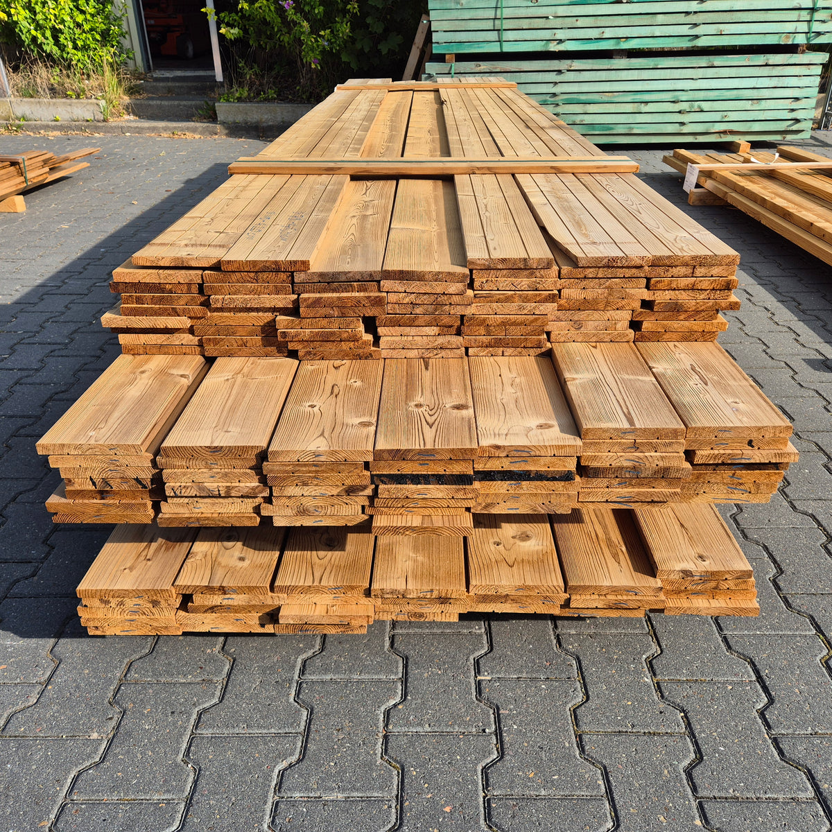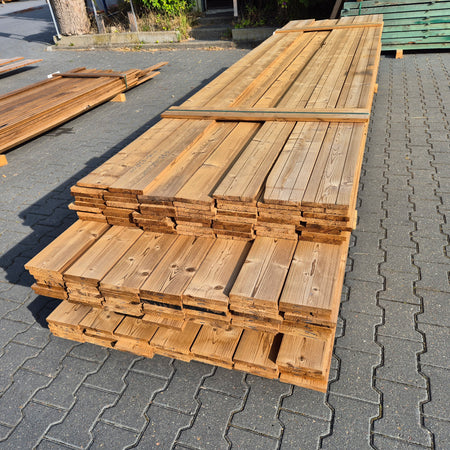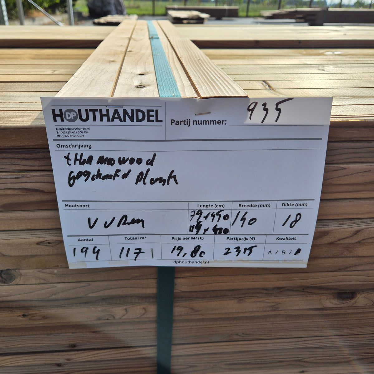 Een partij Thermo Vuren Geschaafde Planken. Deze planken zijn thermisch gemodificeerd voor hun duurzaamheid en warme uitstraling.