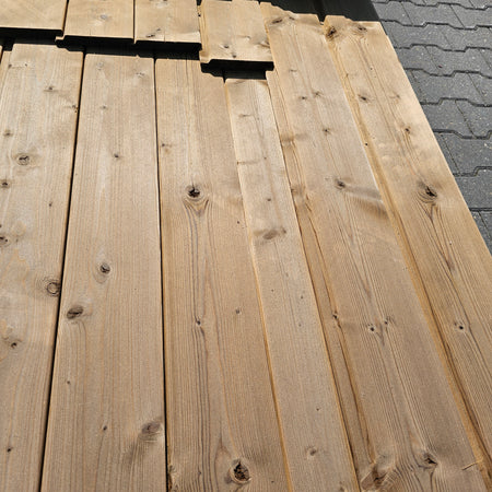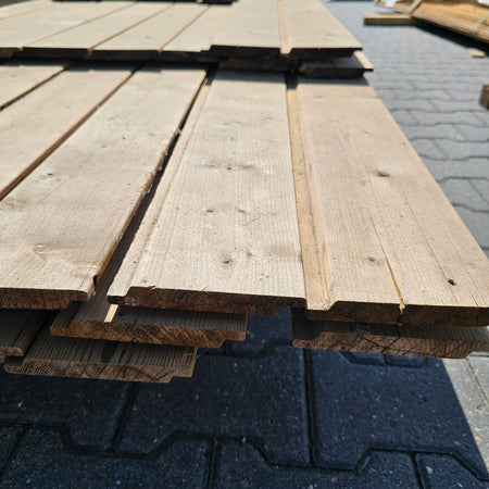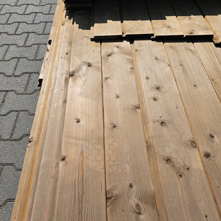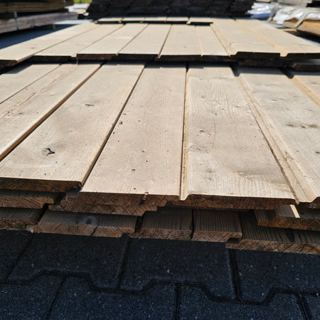 Partij Vuren Gevelbekleding met een Halfhouts Rabat profiel, geschikt voor diverse toepassingen en thermisch gemodificeerd (Thermowood) voor duurzaamheid en een warme uitstraling.