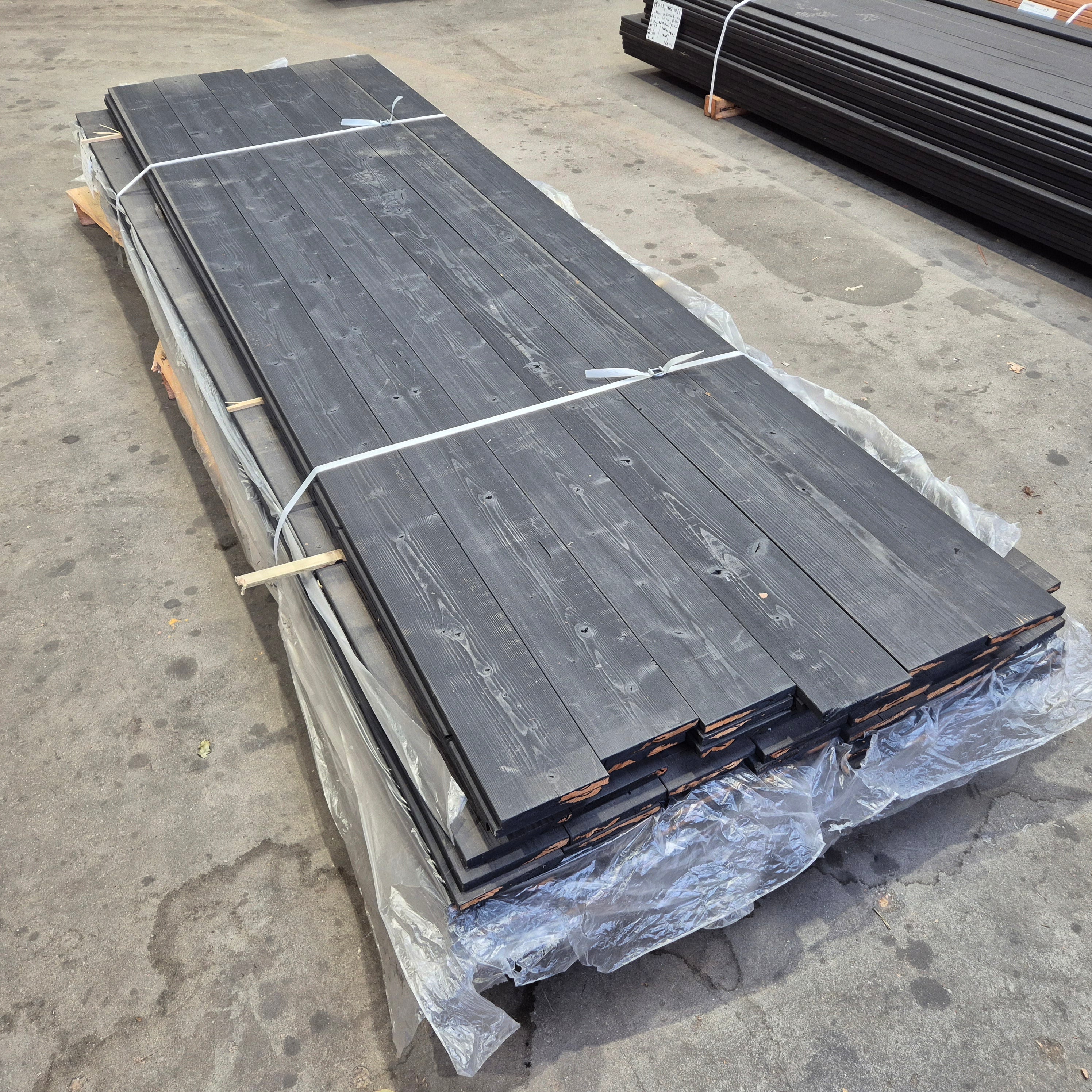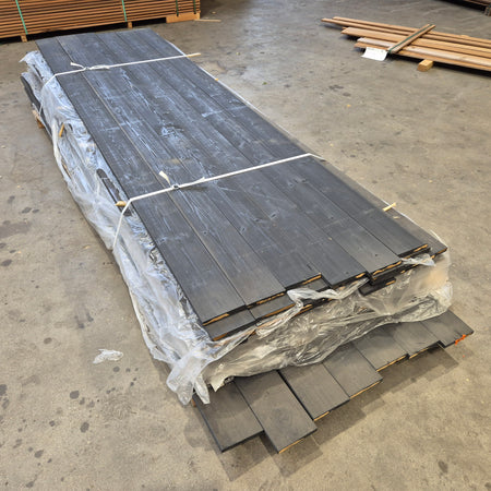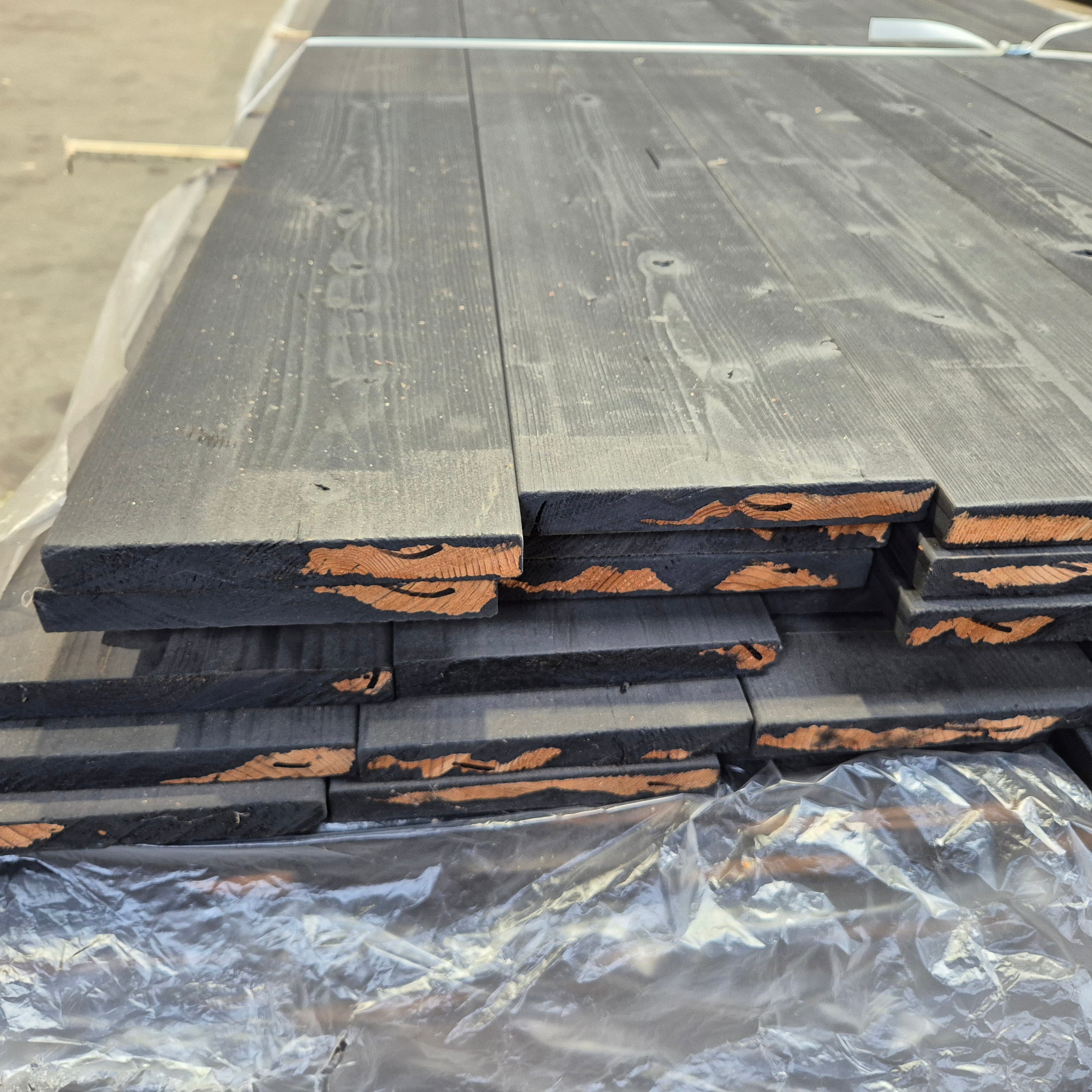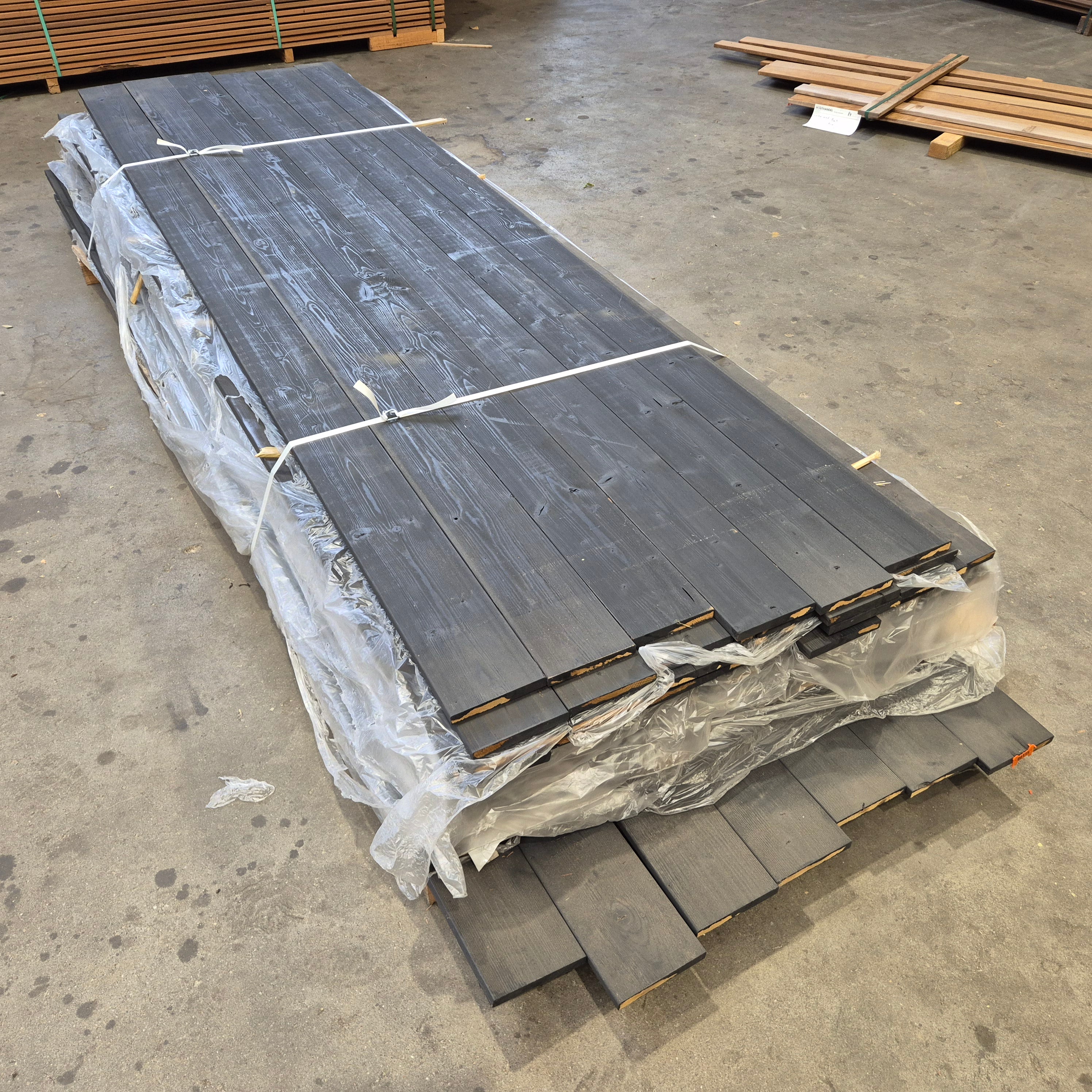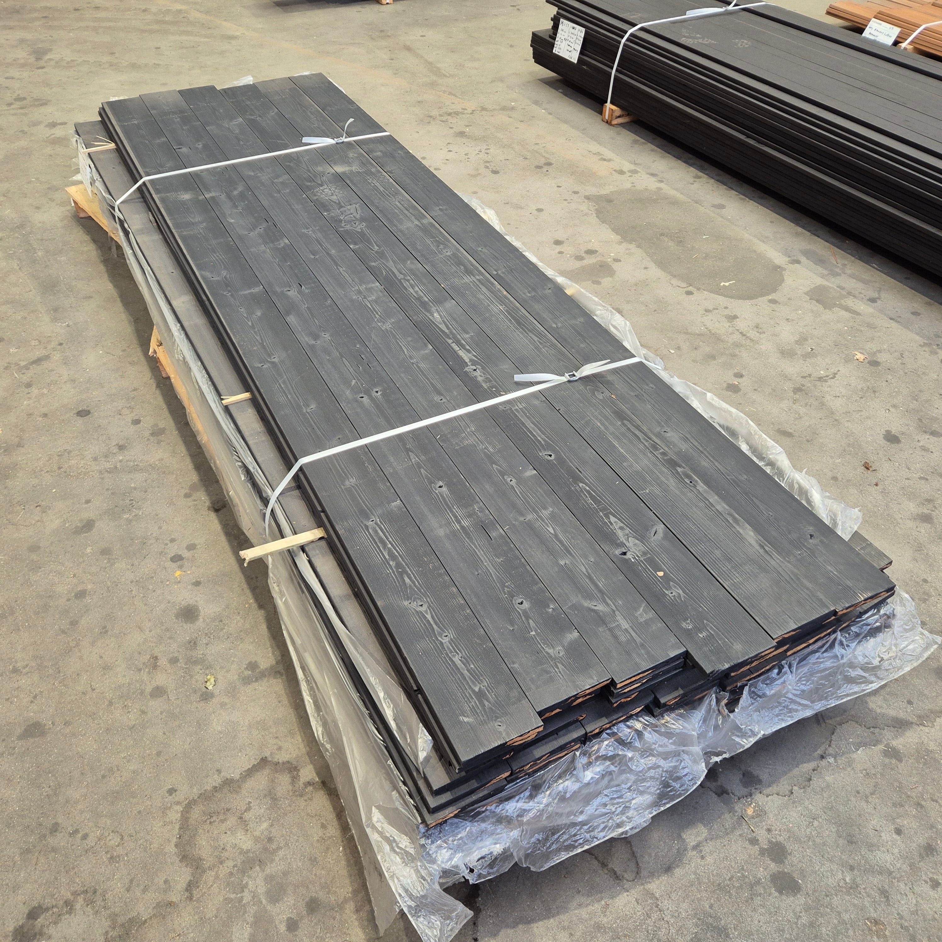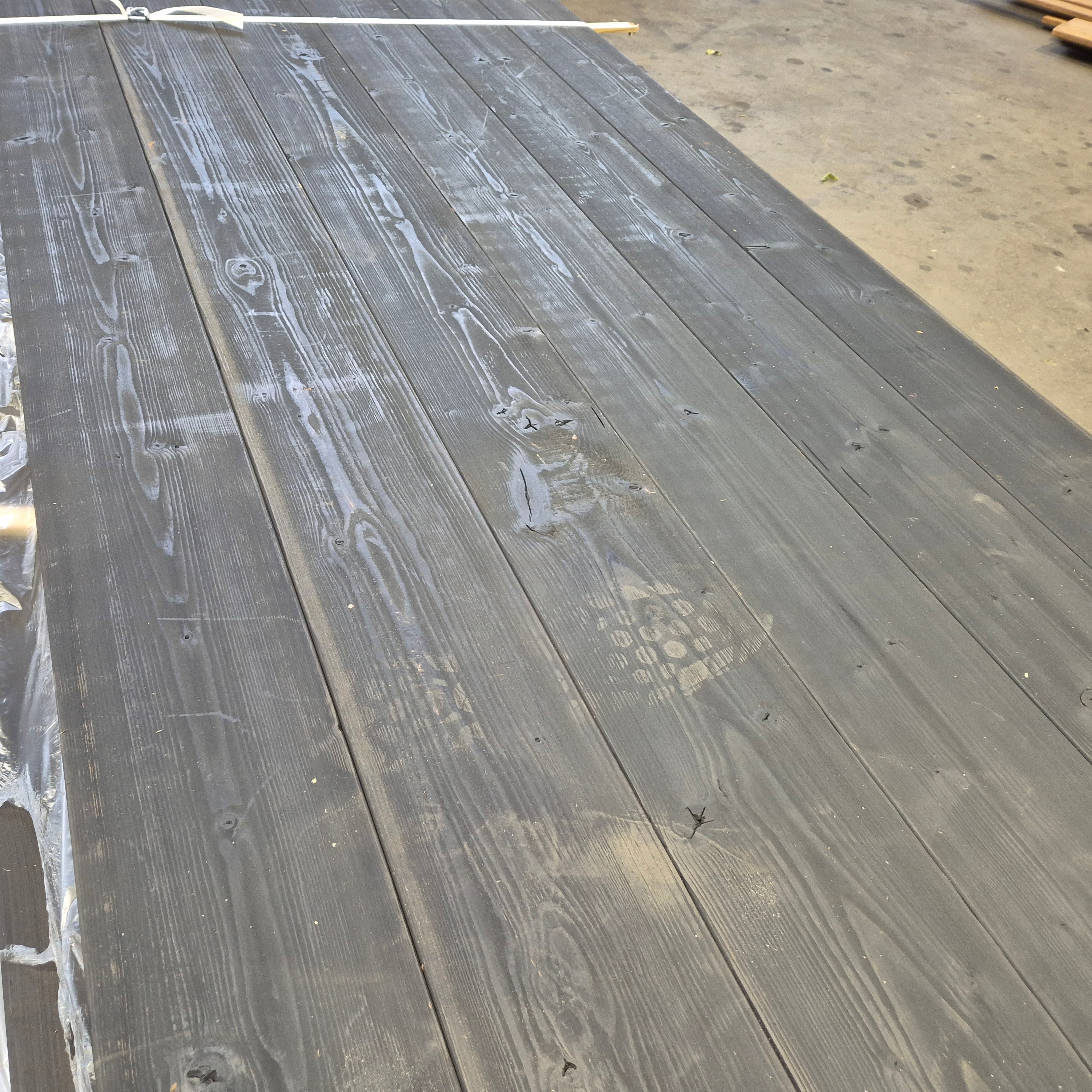 Partij Thermo Vuren planken met een Zwarte afwerking. Dit hout is thermisch gemodificeerd voor de duurzaamheid en warme uitstraling.