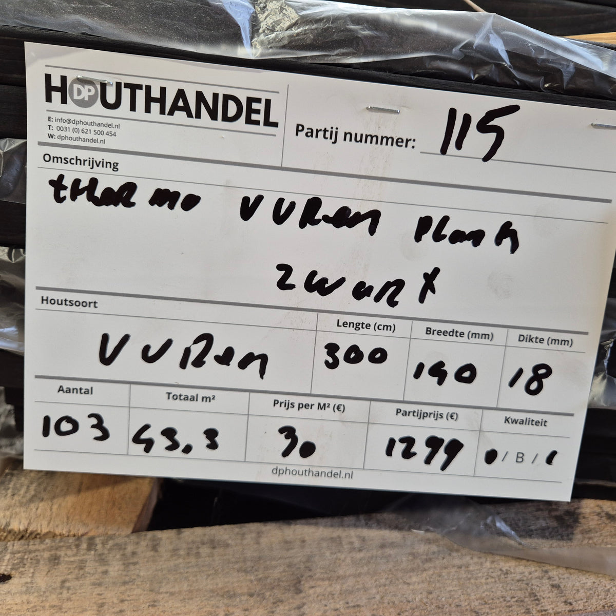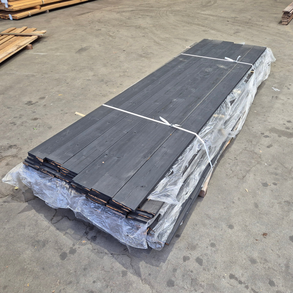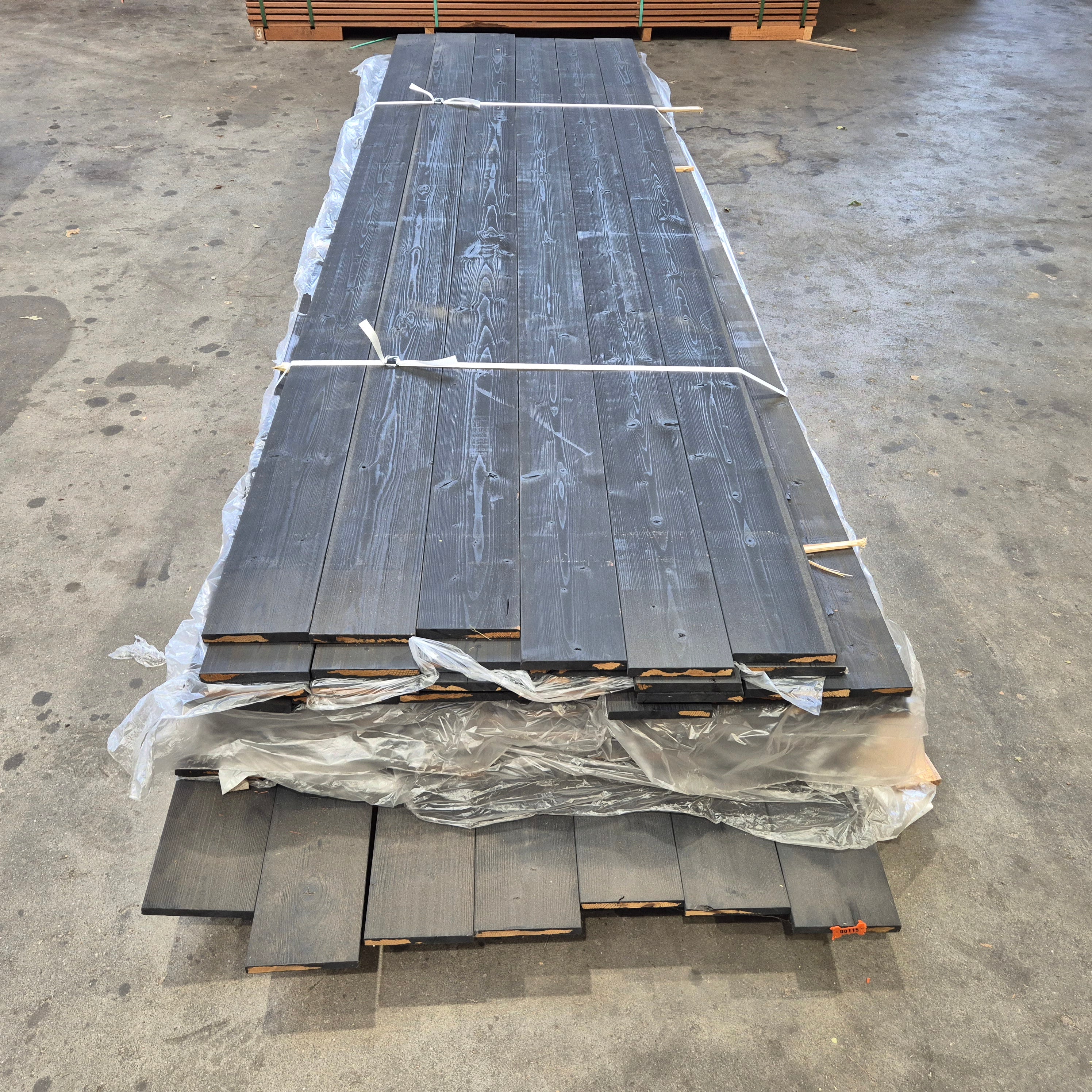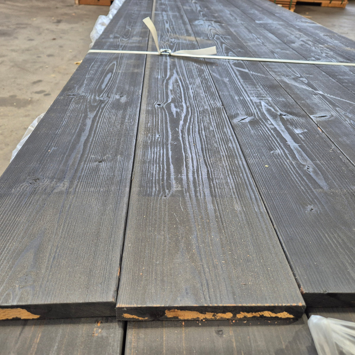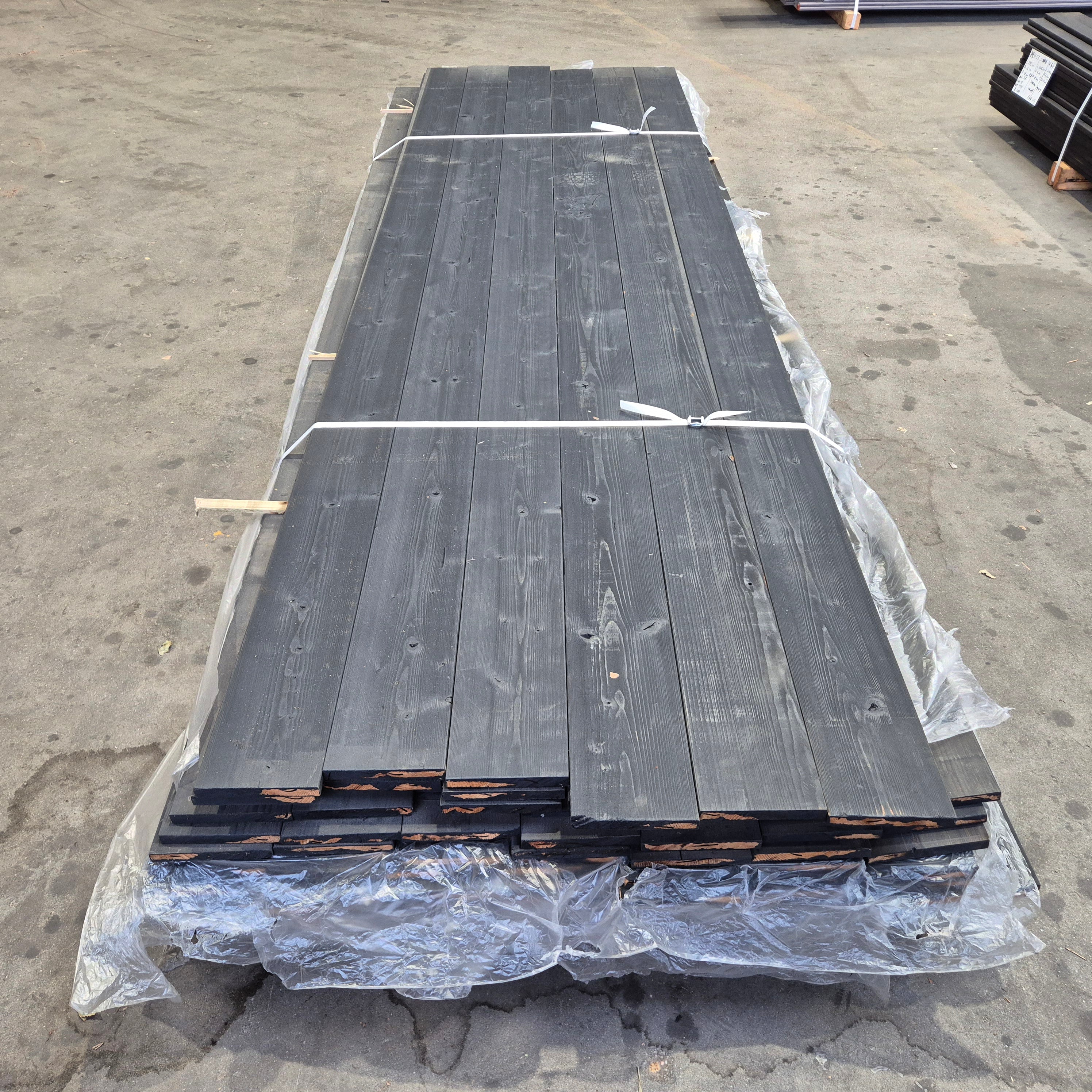 Partij Thermo Vuren planken met een Zwarte afwerking. Dit hout is thermisch gemodificeerd voor de duurzaamheid en warme uitstraling.