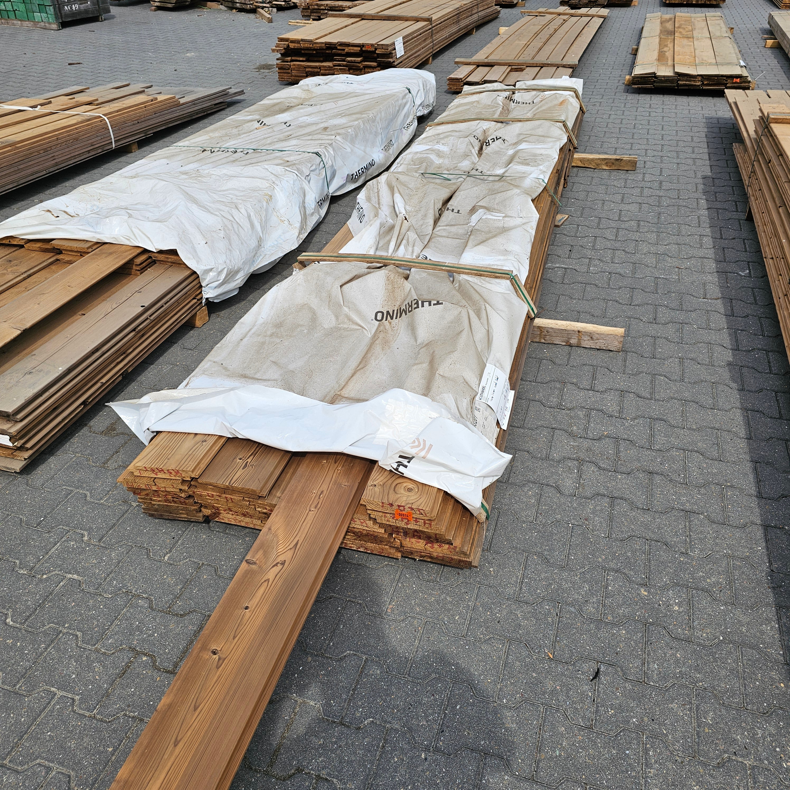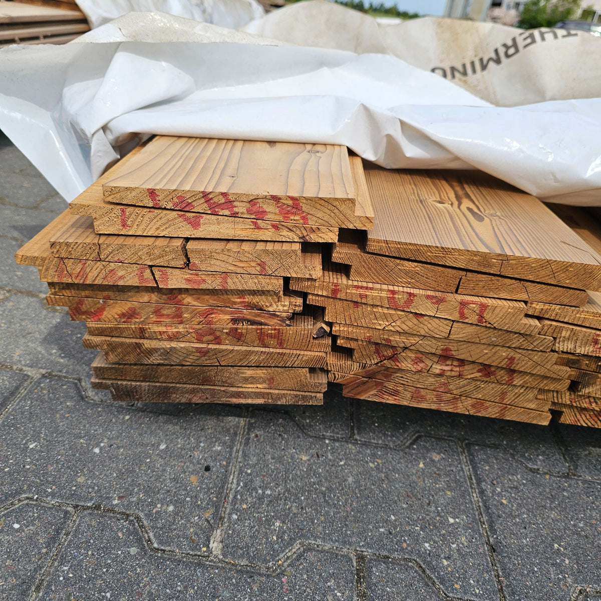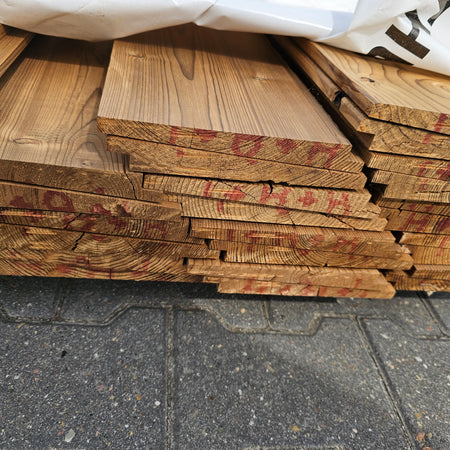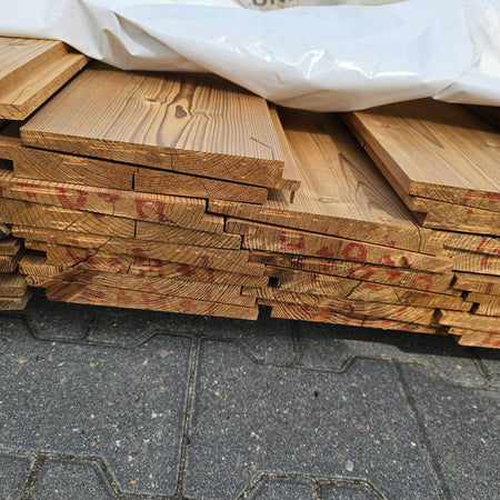 Partij Vuren gevelbekleding met Zweeds Rabat profiel, geschikt voor diverse toepassingen en thermisch gemodificeerd (Thermowood) voor duurzaamheid en een warme uitstraling.