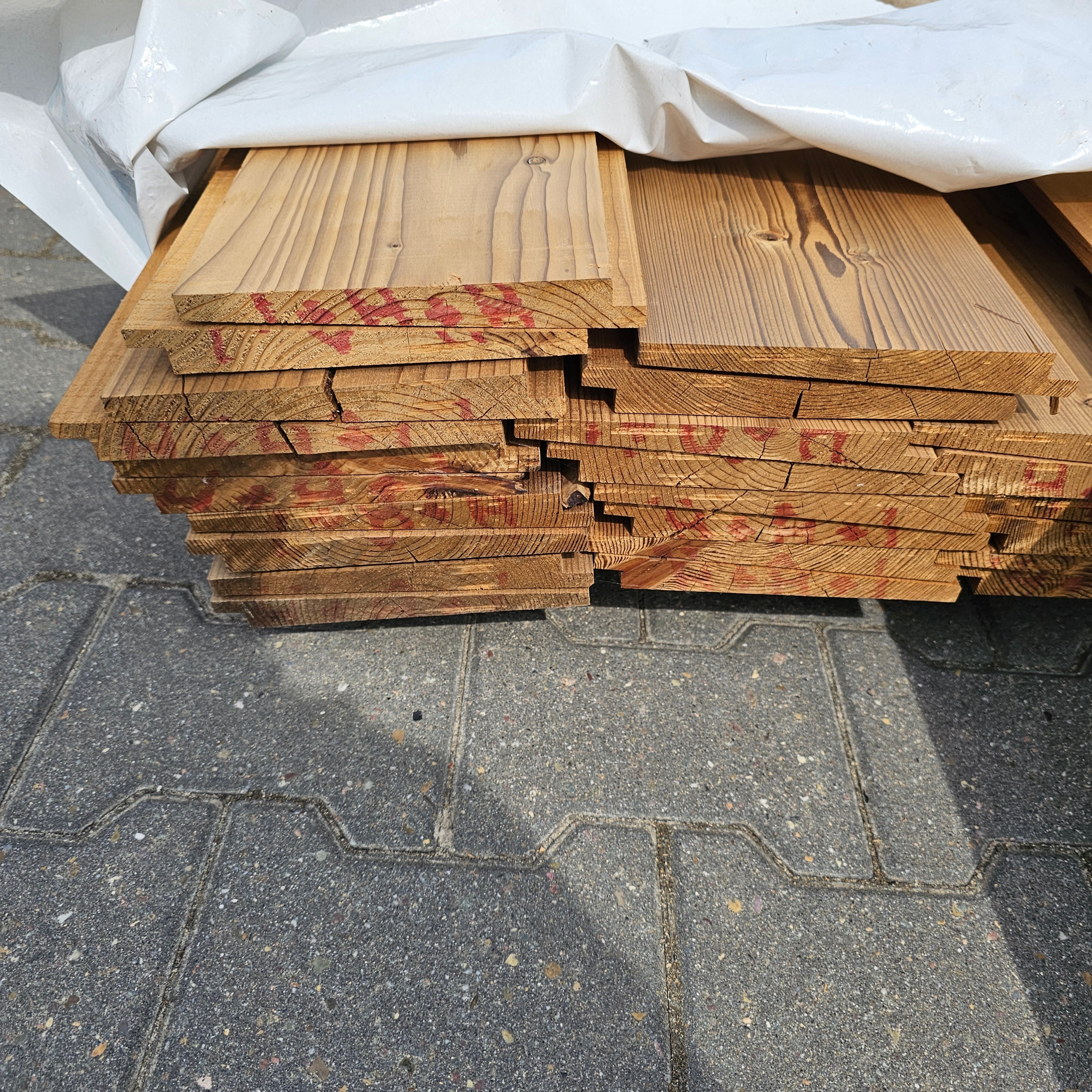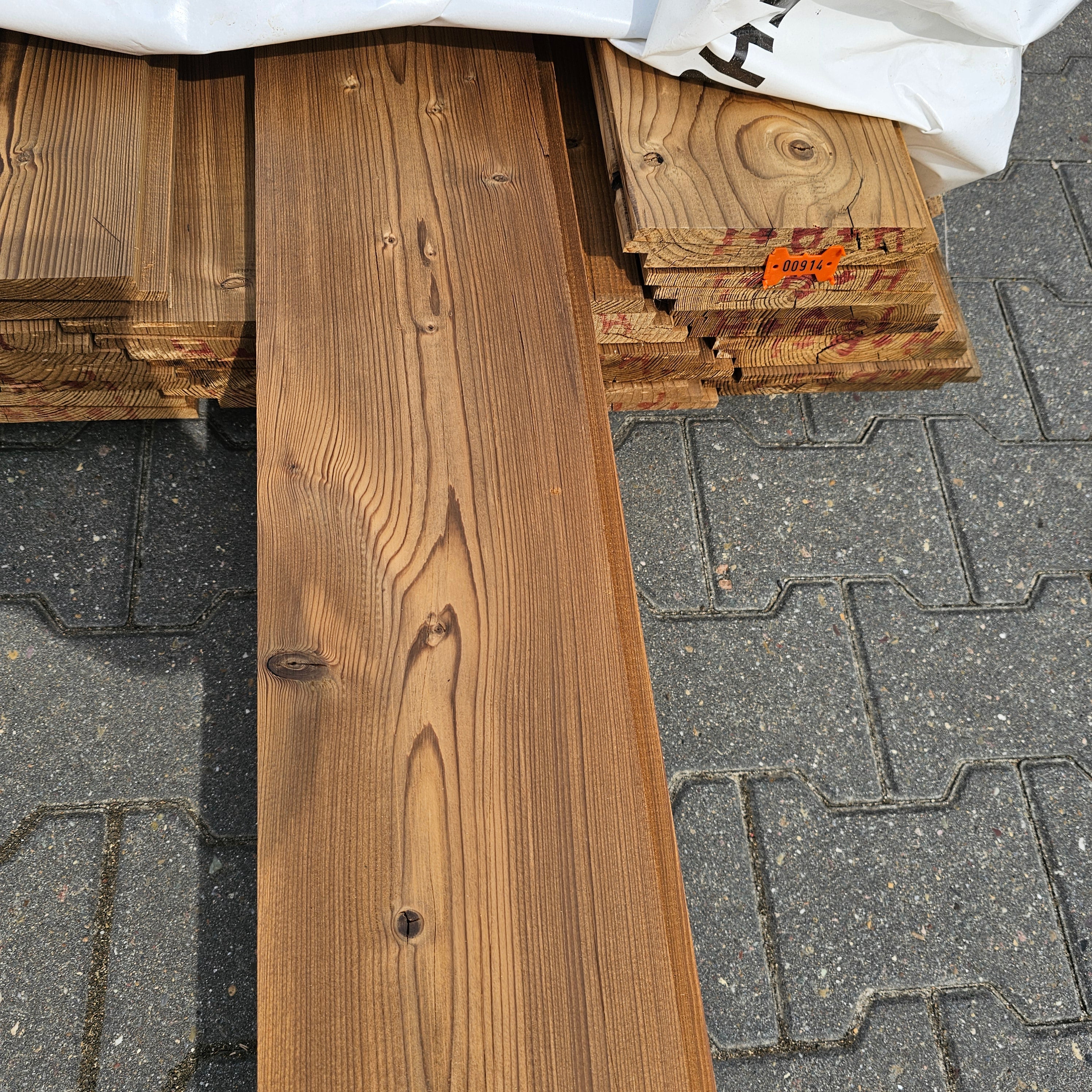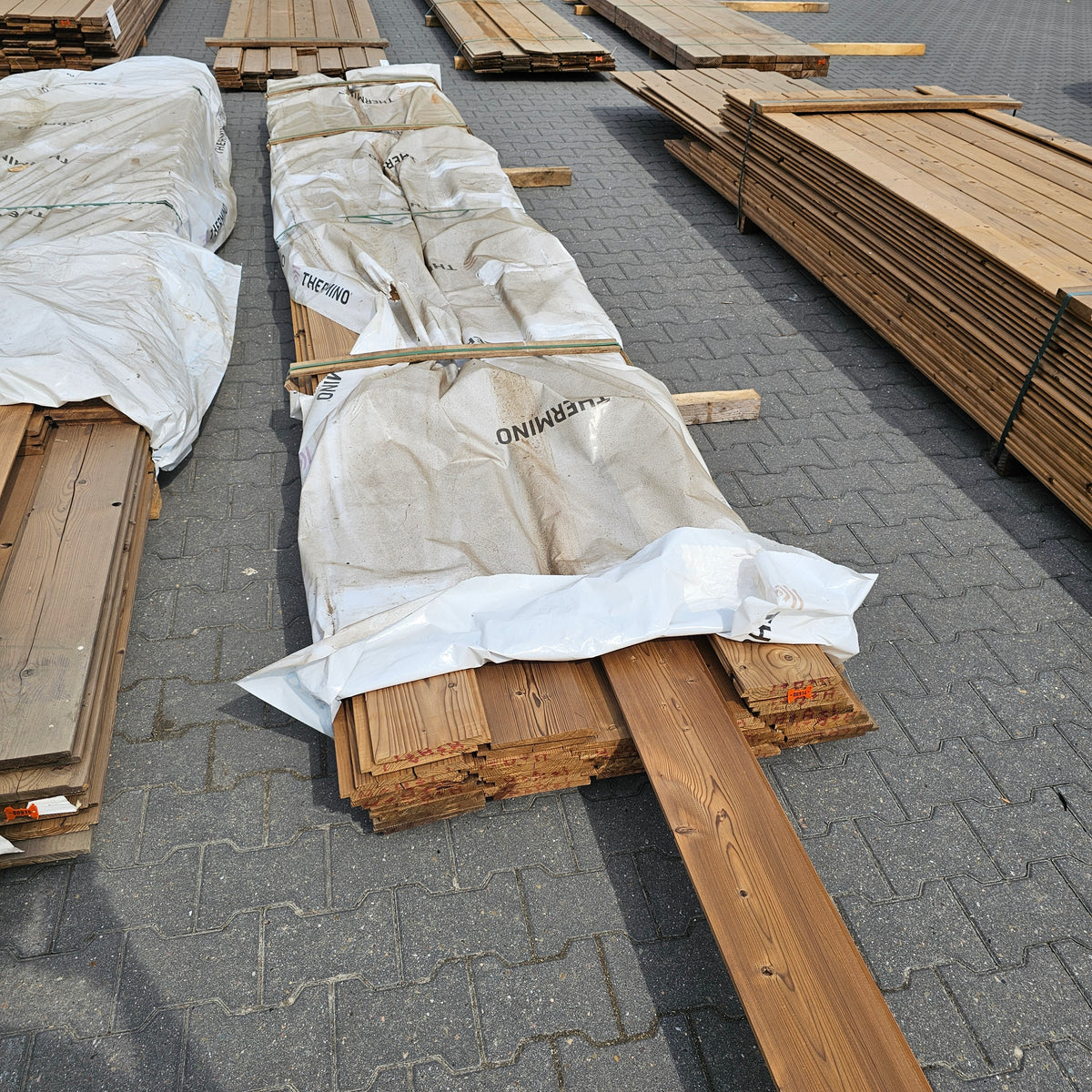 Partij Vuren gevelbekleding met Zweeds Rabat profiel, geschikt voor diverse toepassingen en thermisch gemodificeerd (Thermowood) voor duurzaamheid en een warme uitstraling.