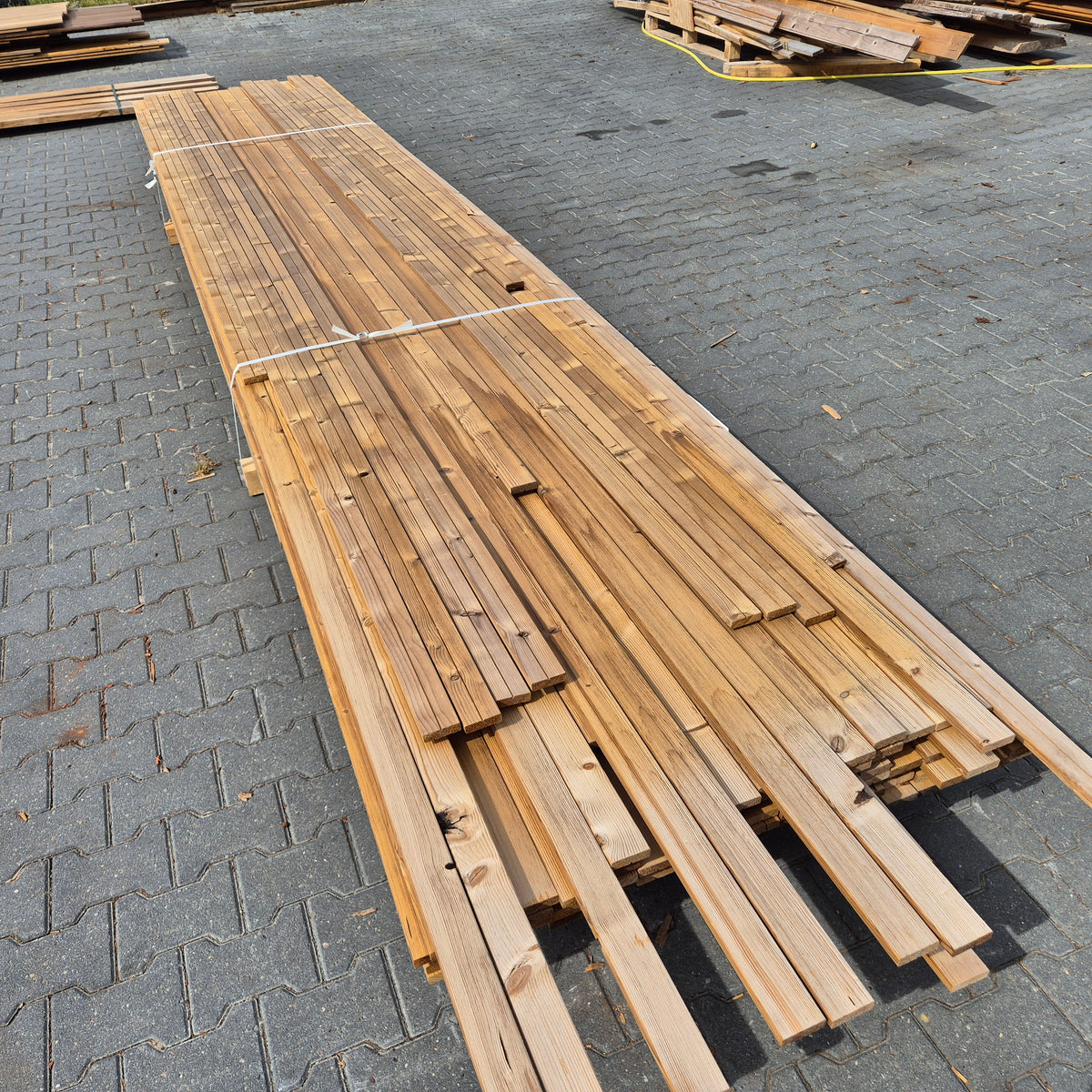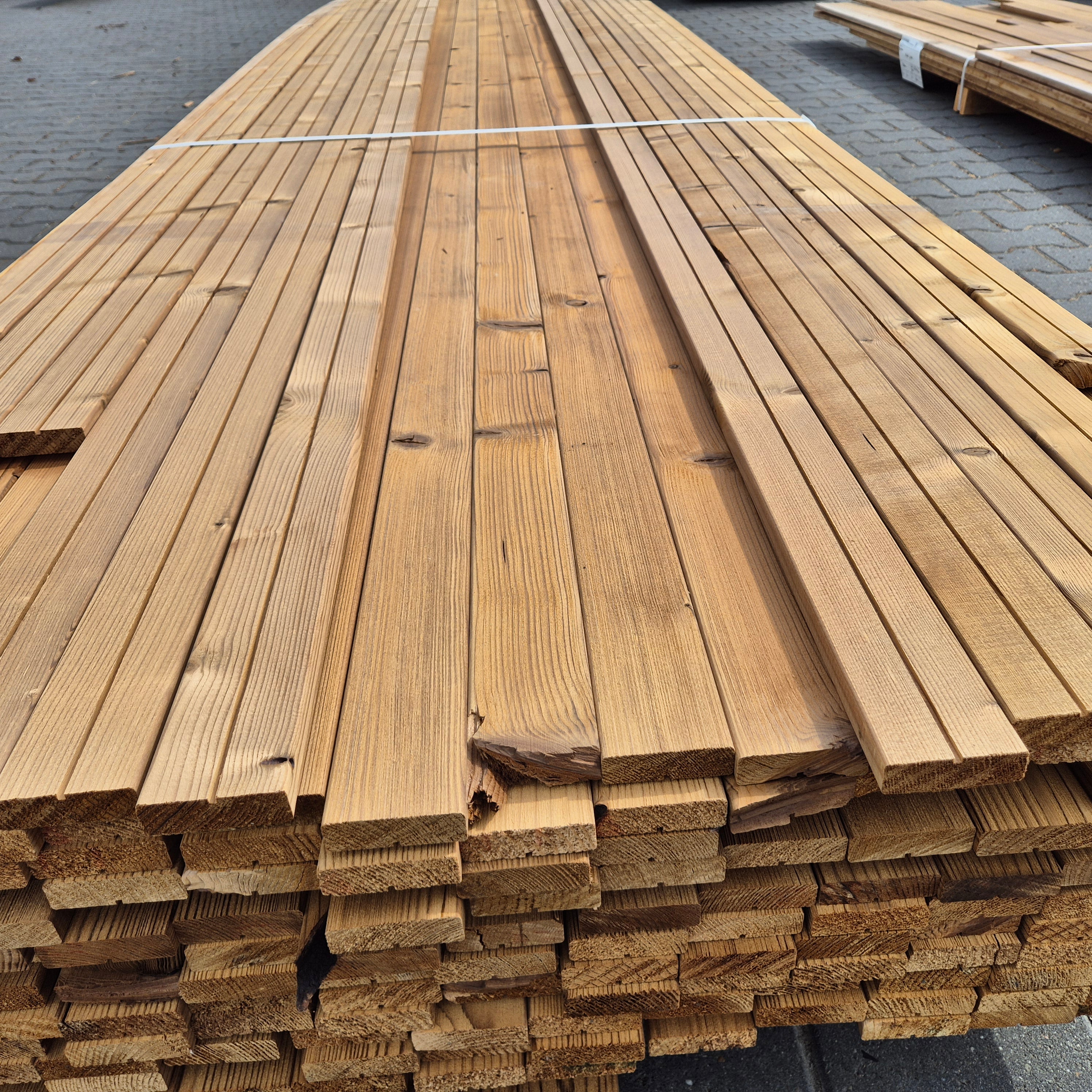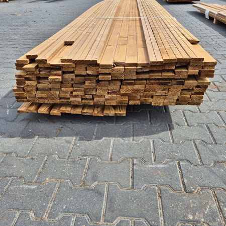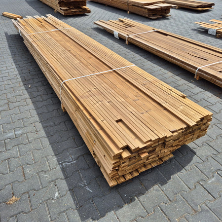 Partij Thermowood Vuren latten. Thermisch gemodificeerd voor een duurzame en warme uitstraling.