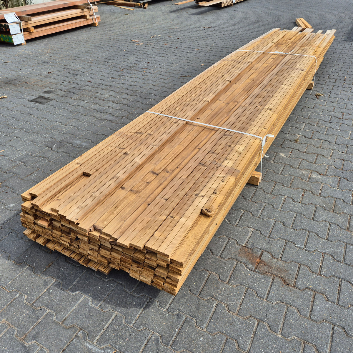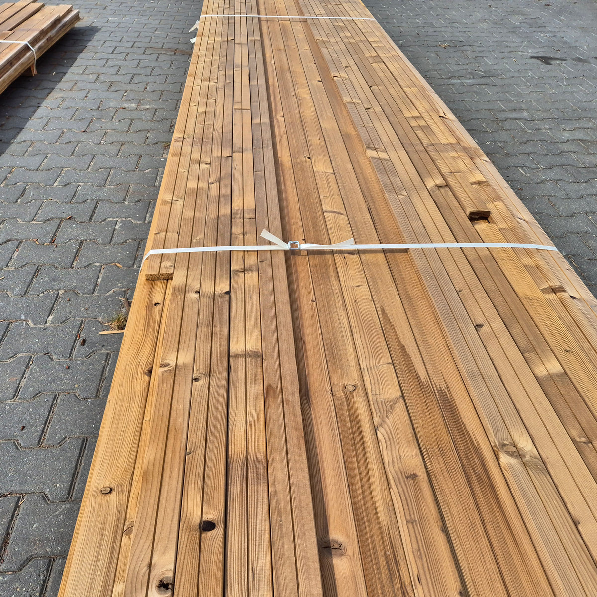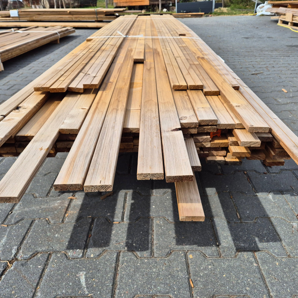 Partij Thermowood Vuren latten. Thermisch gemodificeerd voor een duurzame en warme uitstraling.